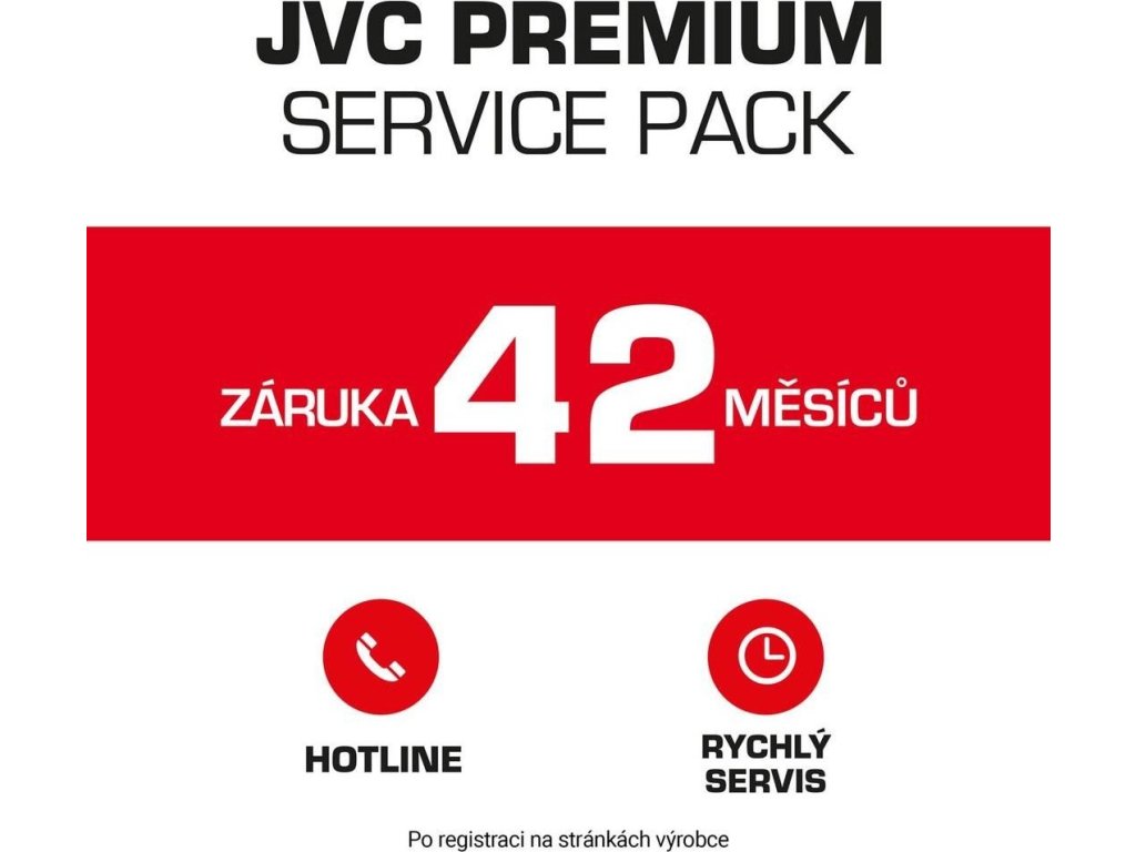 Za kvalitou našich výrobků si stojíme, a proto Vám rádi poskytneme delší záruční lhůtu, která je součástí balíčku prémiových služeb. Součástí je i domácí servis pro úhlopříčky nad 49“, který zahrnuje návštěvu technika u Vás doma v případě záručního zákroku. Pro získání prodloužené 42měsíční záruky je nutná registrace nákupu na www.jvc-tv.cz/guarantee-42/.