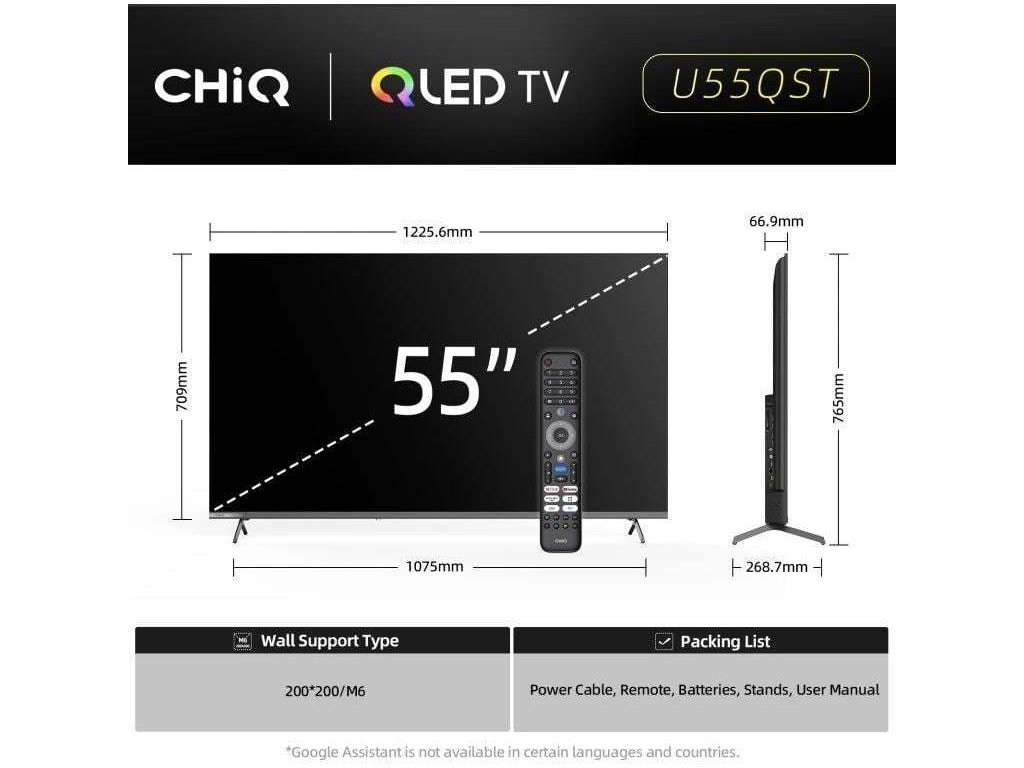 CHiQ 55“ U55QST, ultratenká metalická bezrámečková QLED Smart Google TV 5.0 s několika herními funkcemi, HDR10, HLG, obrazovkou s Ultra HD s rozlišením 3840 x 2160 pixelů, prostorovým zvukem Dolby Audio a dbx-tv.
