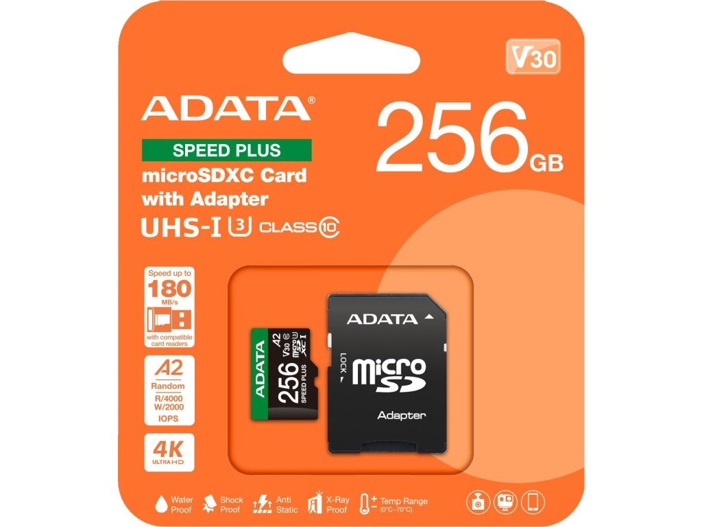 Paměťová karta microSDXC SPEED PLUS má maximální přenosovou rychlost 180 MB/s a je vhodná pro drony, akční kamery a další zařízení. Vyhovuje standardům V30, A2 a dalším, podporuje nahrávání ve vysokém rozlišení a multitasking a je nejlepší volbou pro dobrodruhy.Vlastnosti