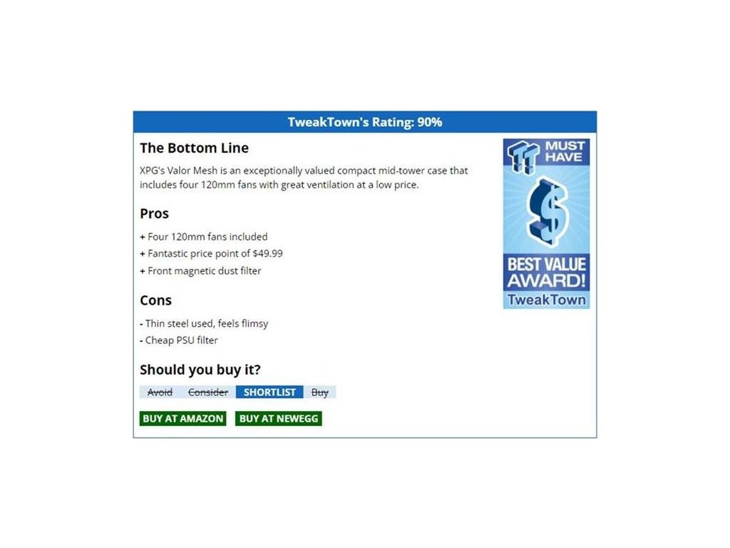 Recenze: XPG Valor Mesh Mid-Tower ATX Case Review (tweaktown.com)Recenze: https://www.eteknix.com/xpg-valor-mesh-case-revieRecenze: https://www.techpowerup.com/review/xpg-valor-mesh/