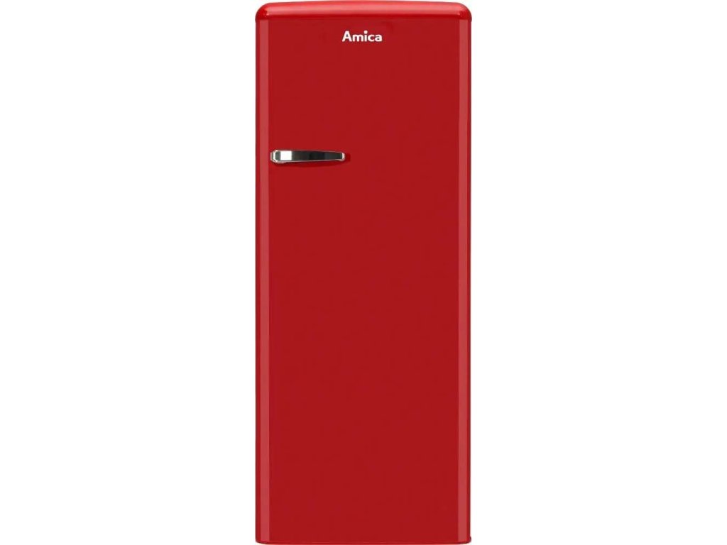 Chladnička AMICA VM 1442 R v červeném retro designu nabízí celkový objem 218 l, z toho 194 l pro chladicí a 24 l pro mrazicí část. Spotřebič patří do energetické třídy E s roční spotřebou 157 kWh a hlučností 41 dB. Uvnitř se nacházejí čtyři police z tvrzeného skla, zásuvka na zeleninu a čtyři dveřní přihrádky. Chladicí část je vybavena automatickým odmrazováním, bočním LED osvětlením a mechanickým ovládáním termostatu.Klíčové vlastnosti lednice AMICA VM 1442 R