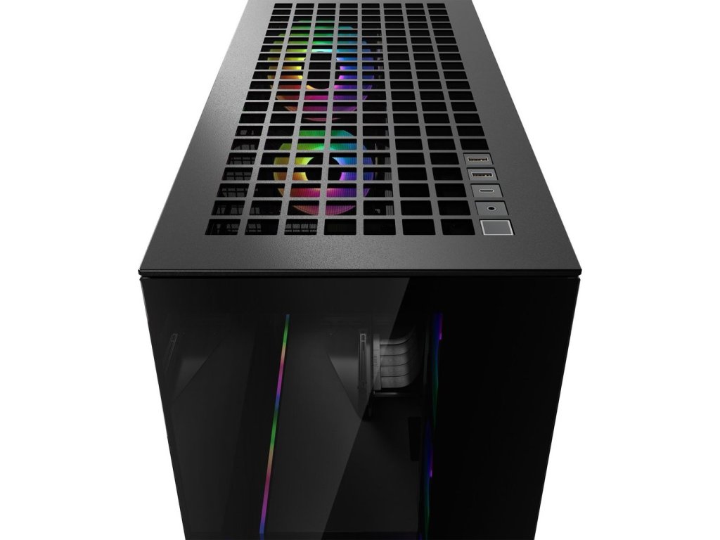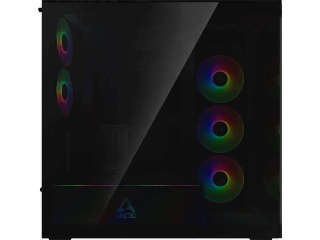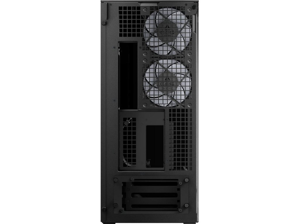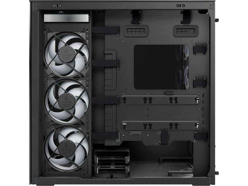 Skříň je vybavena celkem 5 A-RGB ventilátory – dvěma 120mm vzadu a třemi 140mm na boku, které zajišťují optimální chlazení i při vysokém zatížení. Prostorný interiér pojme grafické karty až 482 mm, CPU chladiče do výšky 171 mm a zdroje až 318 mm.