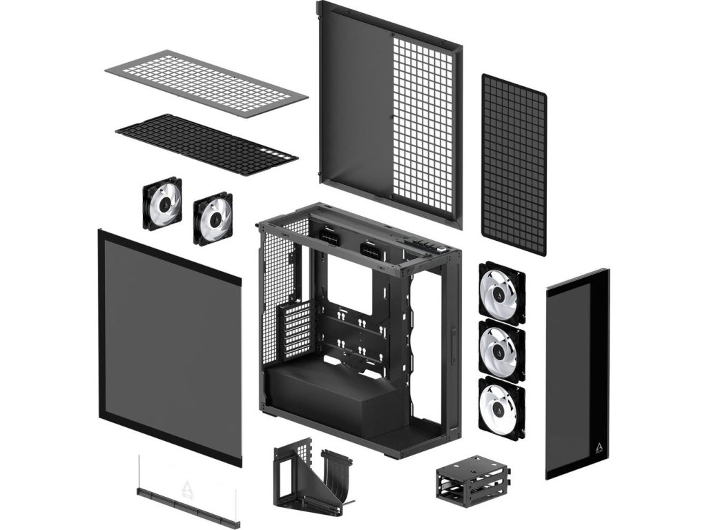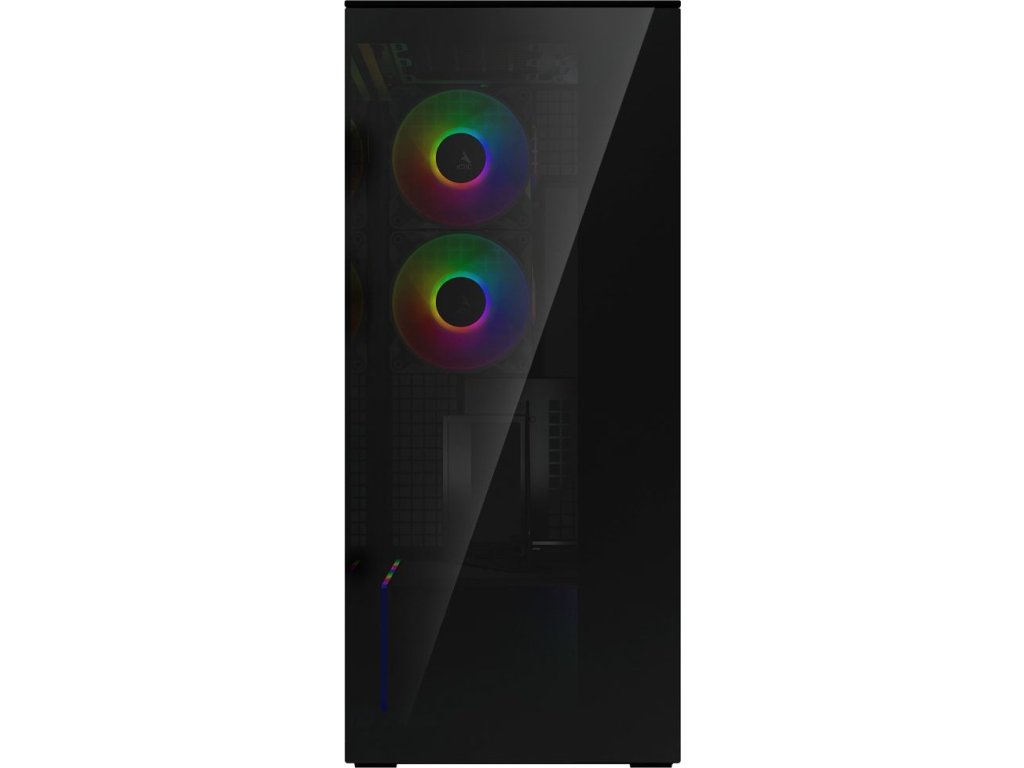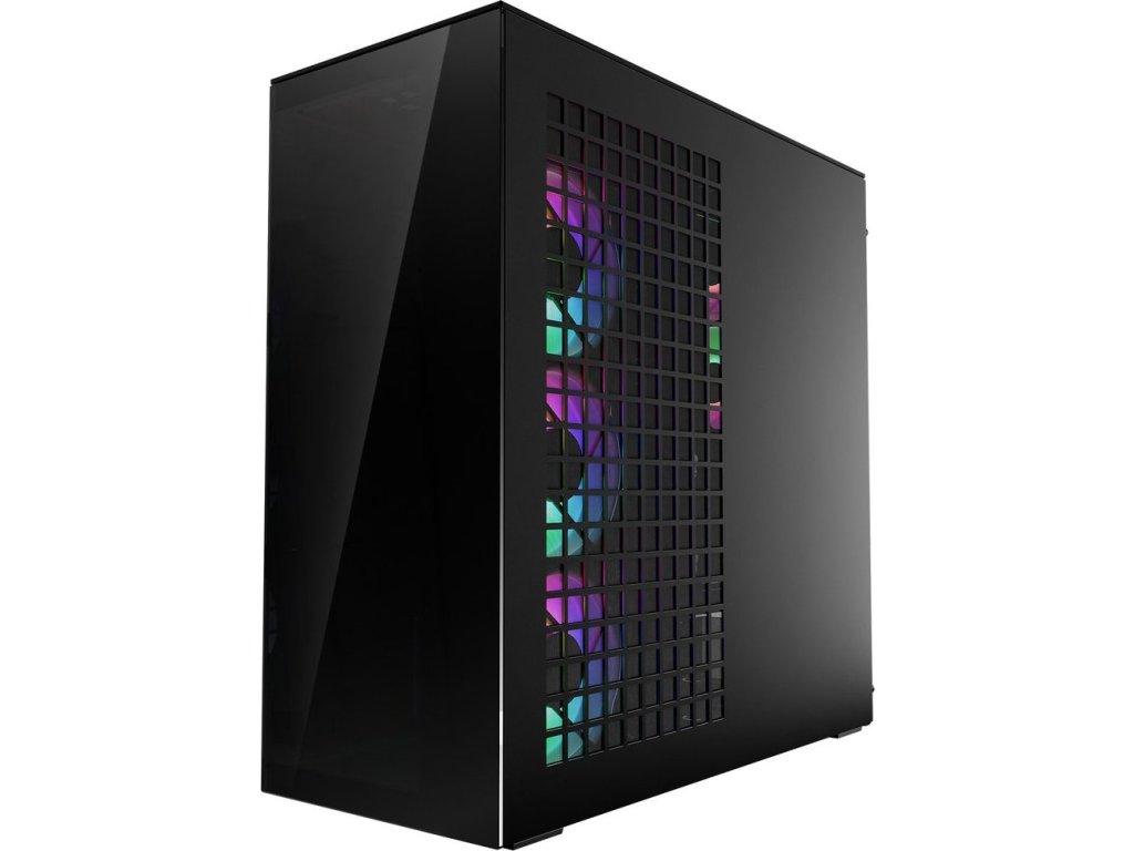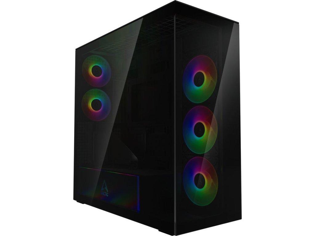 Skříň je vybavena celkem 5 A-RGB ventilátory – dvěma 120mm vzadu a třemi 140mm na boku, které zajišťují optimální chlazení i při vysokém zatížení. Prostorný interiér pojme grafické karty až 482 mm, CPU chladiče do výšky 171 mm a zdroje až 318 mm.