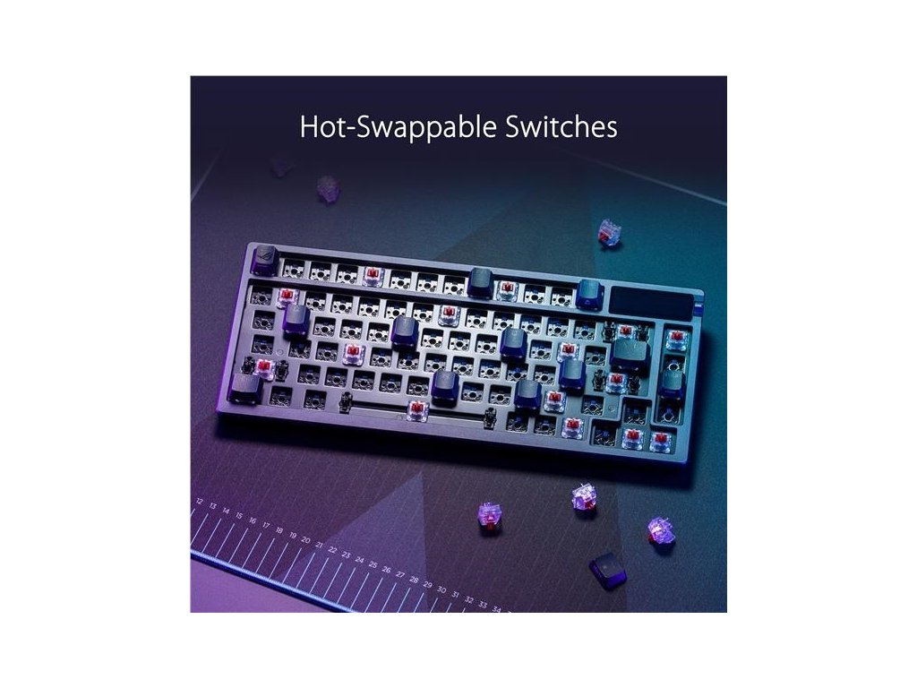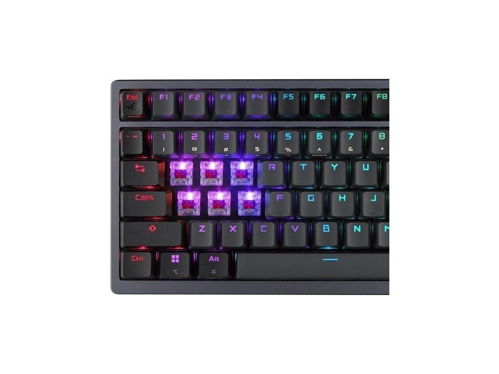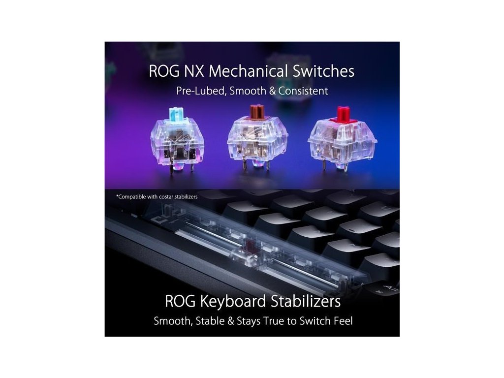Mechanické spínače ROG NX vyměnitelné za provozu: Předem namazané spínače pro hladší cvakání a eliminaci odskakování; rychlé ovládání a vyladěné křivky síly ROG poskytují skvělý pocit a konzistenci kláves