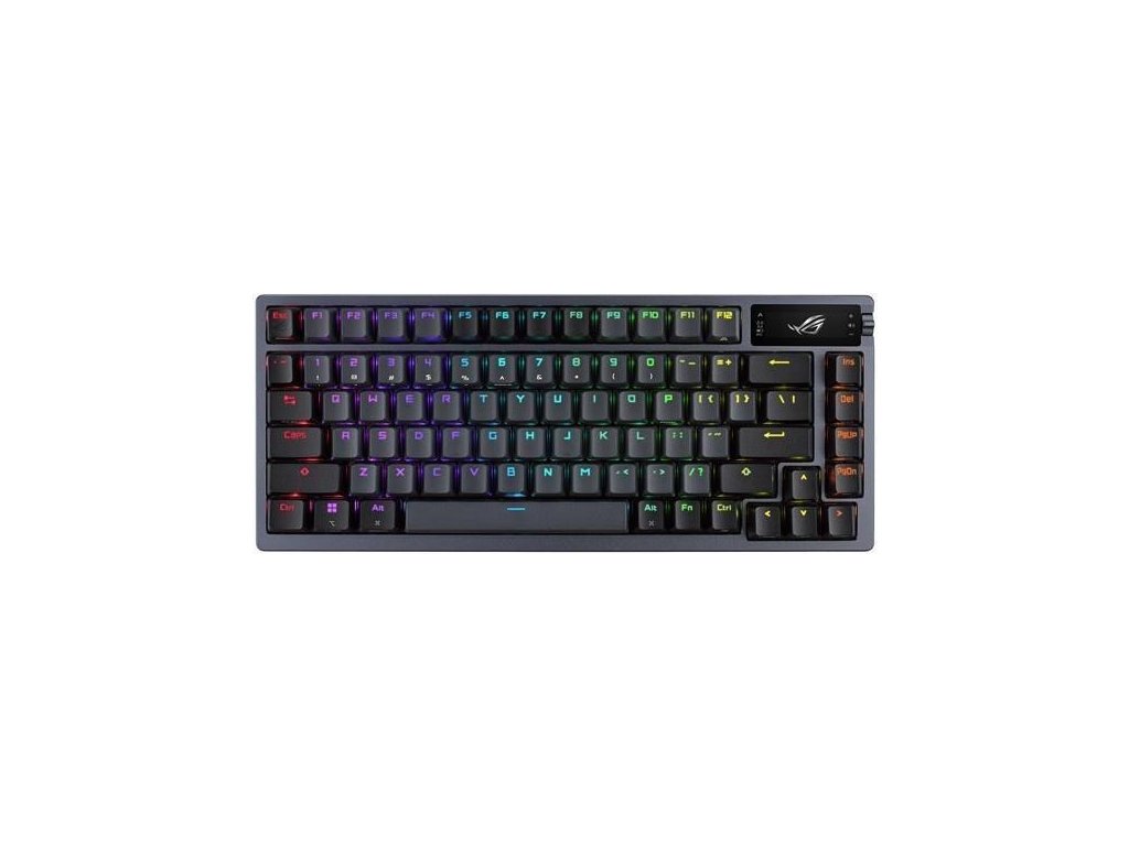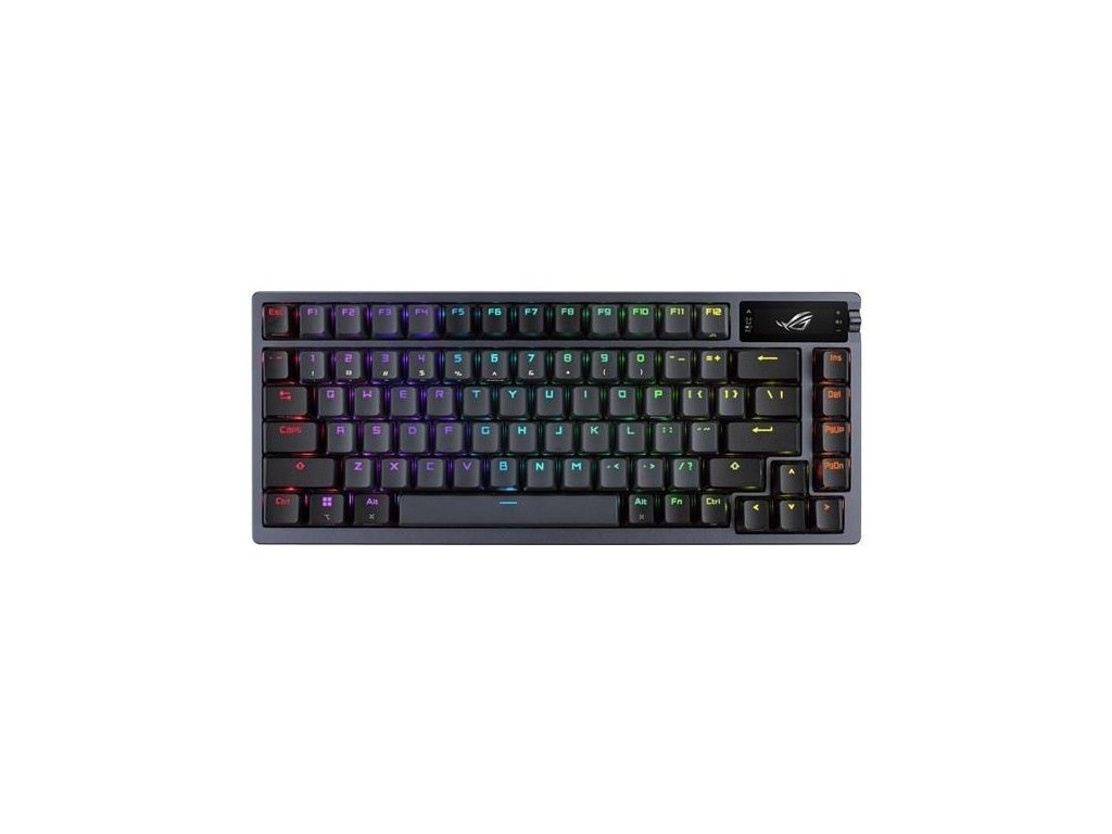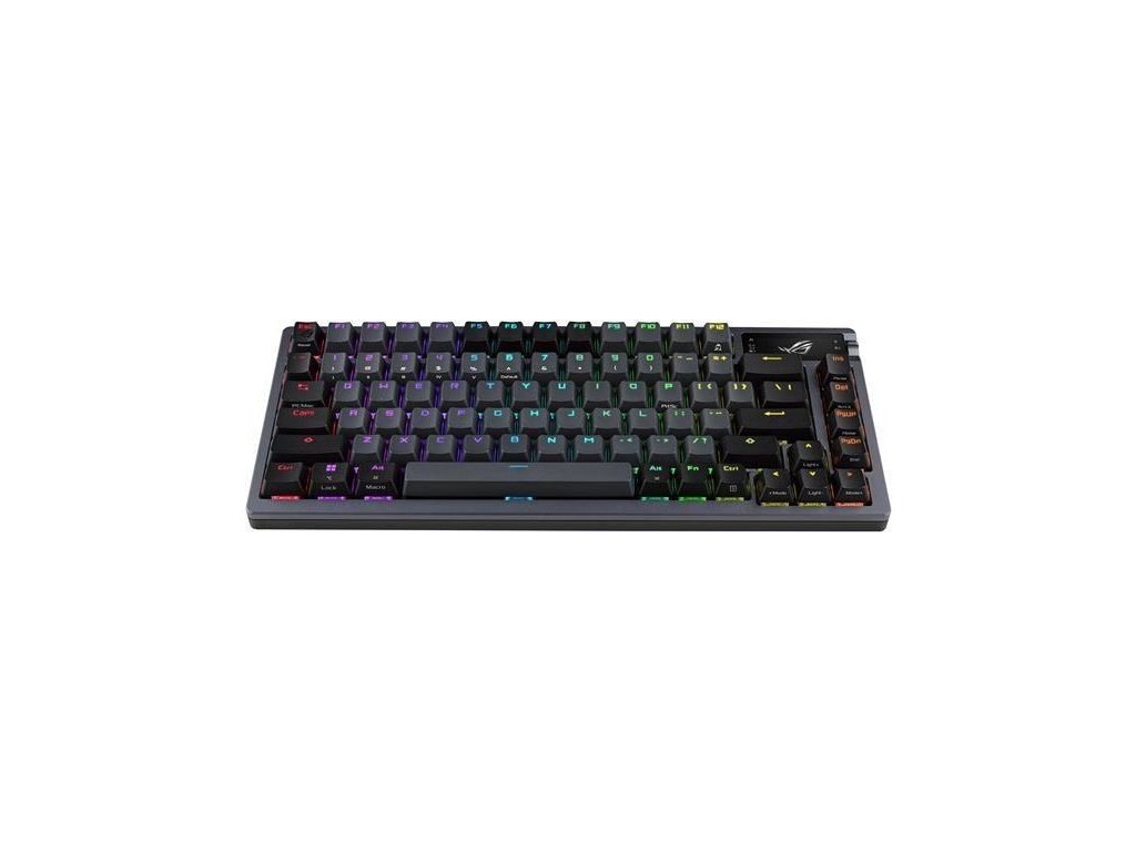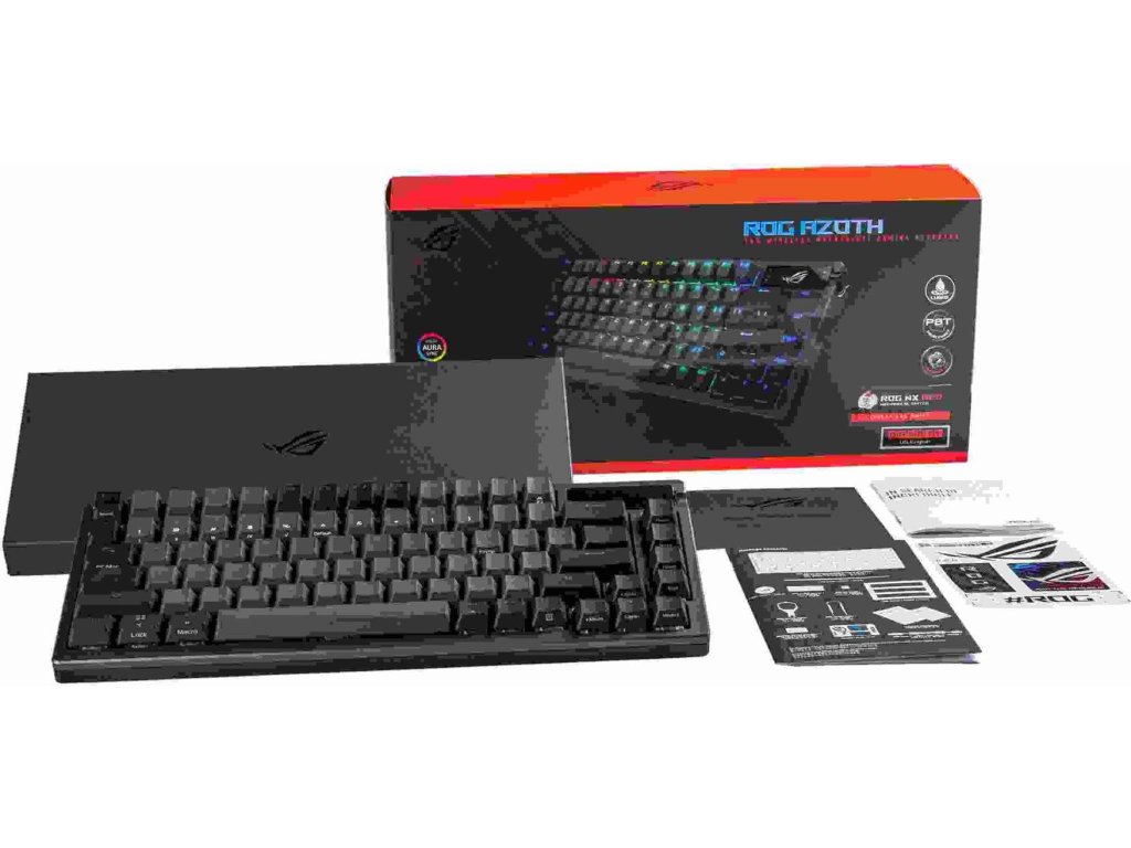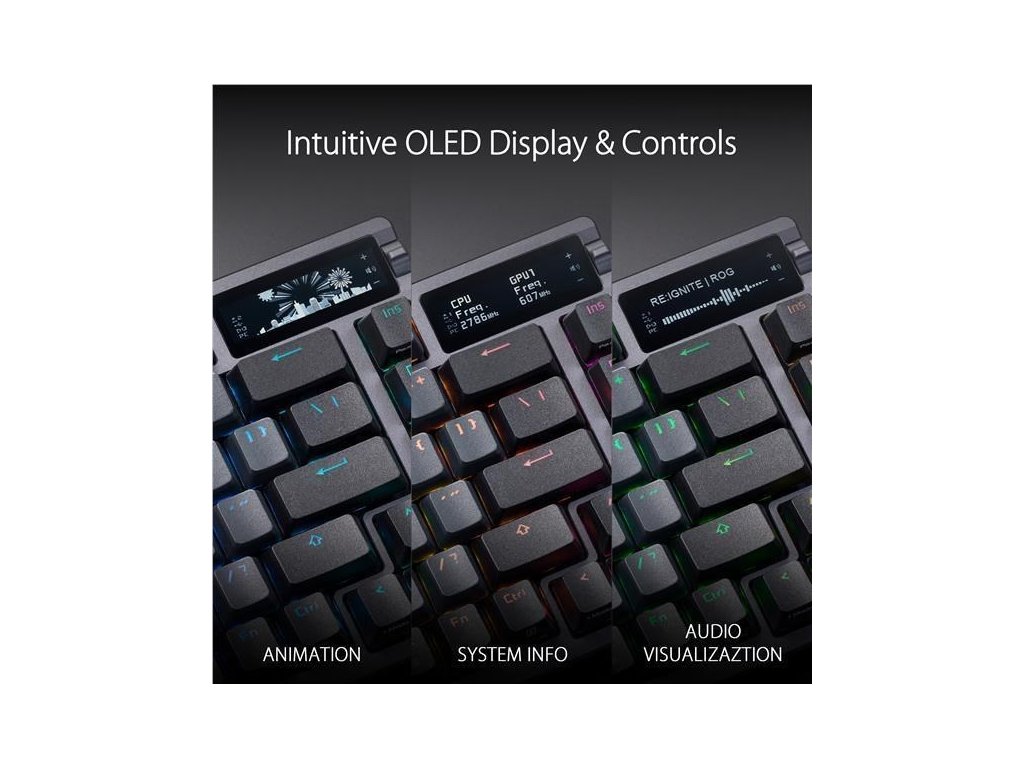 Zakázková herní klávesnice ROG Azoth s tvarovým faktorem klávesnice 75, těsněním, třívrstvou tlumicí pěnou a kovovým horním krytem, vysoce přizpůsobitelná s předem namazanými mechanickými spínači ROG NX vyměnitelnými za provozu, stabilizátory klávesnice ROG, kryty kláves PBT doubleshot a mazací sadou, tri - připojení režimu s 2,4 GHz technologií SpeedNova, OLED displejem, třícestným ovládacím knoflíkem, třemi úhly náklonu a podporou MacJedinečný design uchycení těsnění: Silikonový držák těsnění se třemi vrstvami tlumící pěny v kombinaci poskytují bezkonkurenční zážitek z psaní