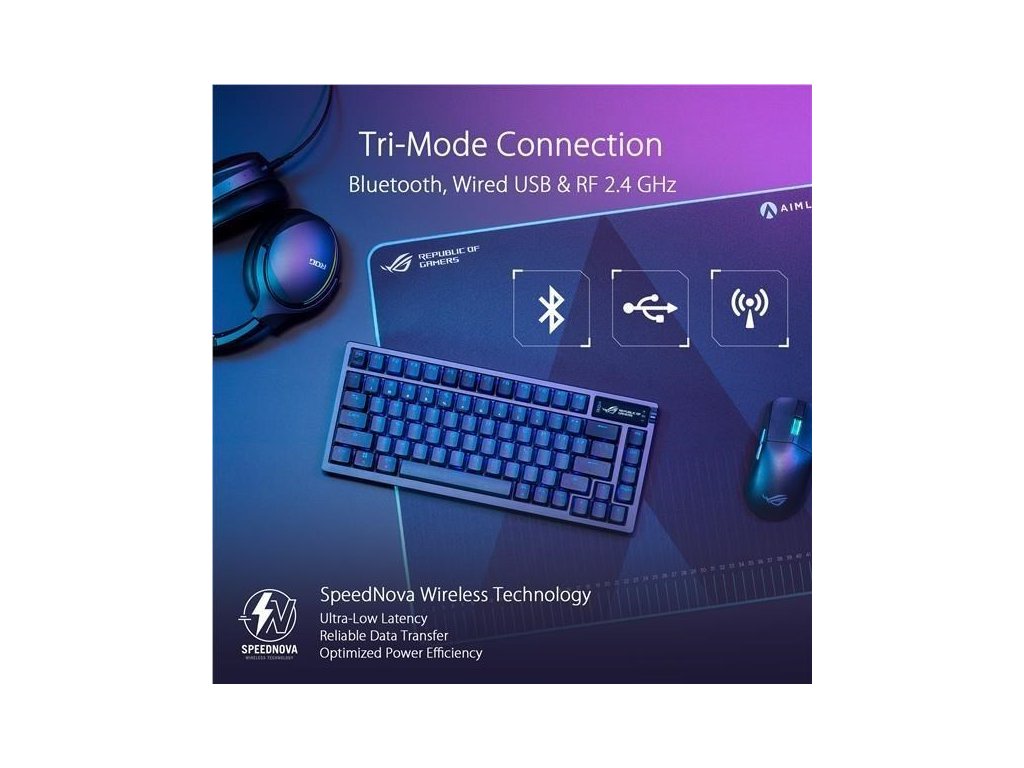 Připojení ve třech režimech: Použijte Bluetooth® k připojení a přepínání mezi třemi zařízeními najednou, bezdrátová technologie ROG SpeedNova poskytuje až 2 000+ hodin hraní s nízkou latencí v bezdrátovém režimu 2,4 GHz RF (OLED a RGB vypnuto), nebo použijte standardní kabelové USB