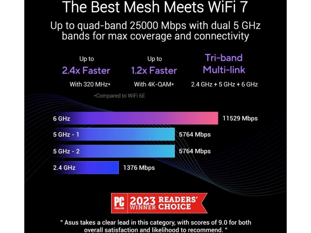 ASUS ZenWiFi BQ16BE25000 Quad Band WiFi 7 (802.11be) Mesh Router, pokrytí až 8000 čtverečních stop, dva porty 10G, Smart Home Master s multi-SSID pro IoT, VPN a rodičovskou kontrolu, zabezpečení sítě bez předplatného, AiMesh, 4G a 5G mobilní tethering
