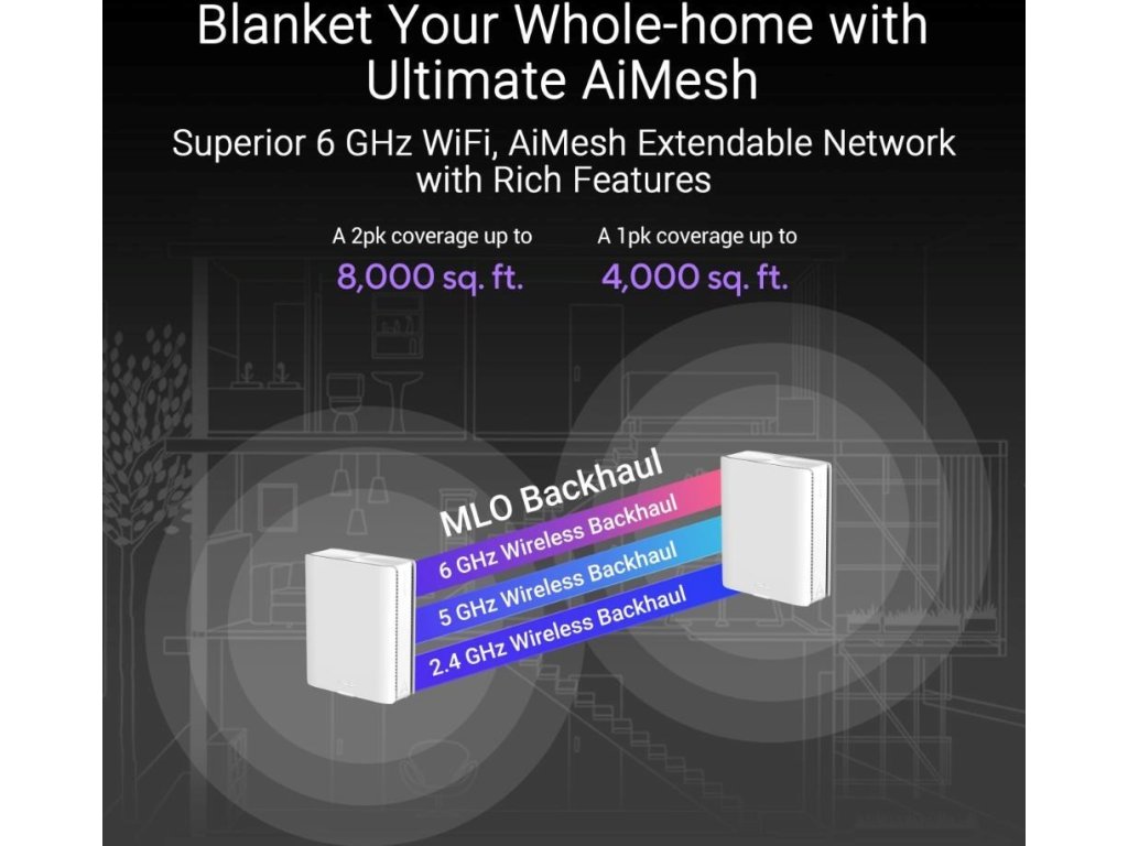Ultimate AiMesh powered by AI poskytuje robustní backhaul připojení s pokrytím až 8000 čtverečních stop (2pk) a funkčně bohatou síť pro celou domácnost, která se škáluje s libovolnými rozšiřitelnými routery ASUS.