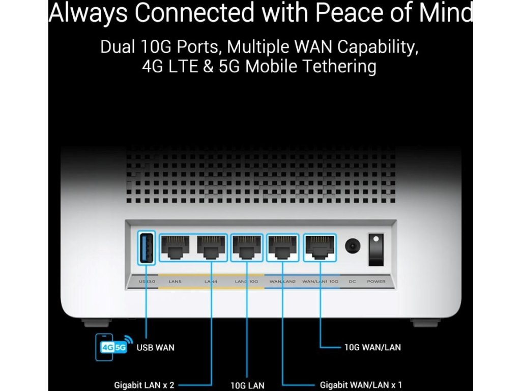 Vytvořte si neustále zapnutý internet díky všestranným možnostem konfigurace WAN a praktickému portu USB připravenému pro mobilní tethering 4G LTE a 5G.