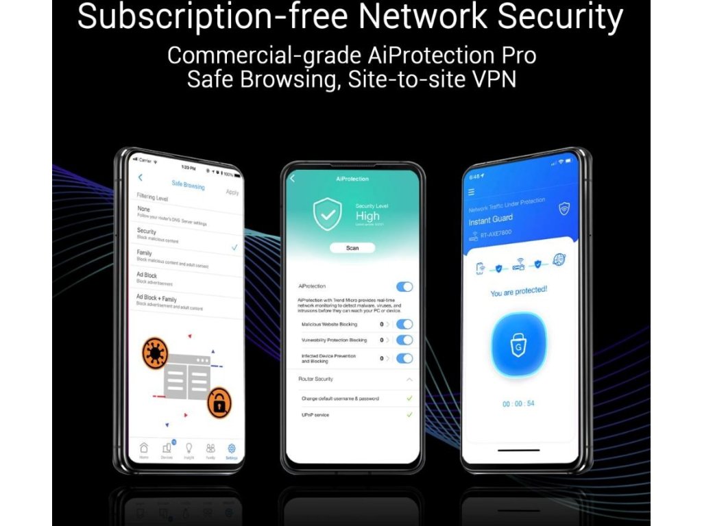 Zůstaňte v bezpečí díky komerčnímu řešení AiProtection Pro powered by Trend Micro™, bezpečnostní kontrole jedním klepnutím, komplexní podpoře VPN a site-to-site VPN.