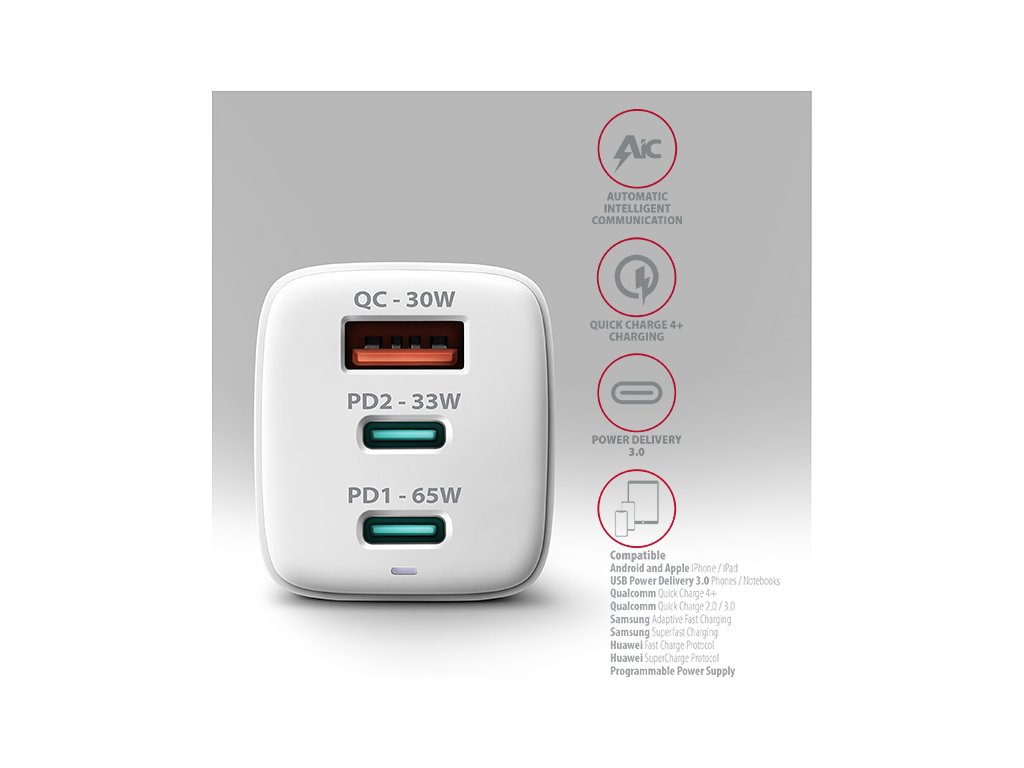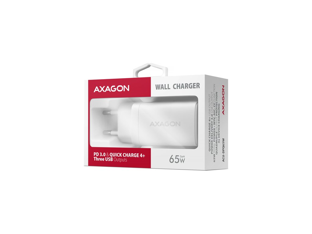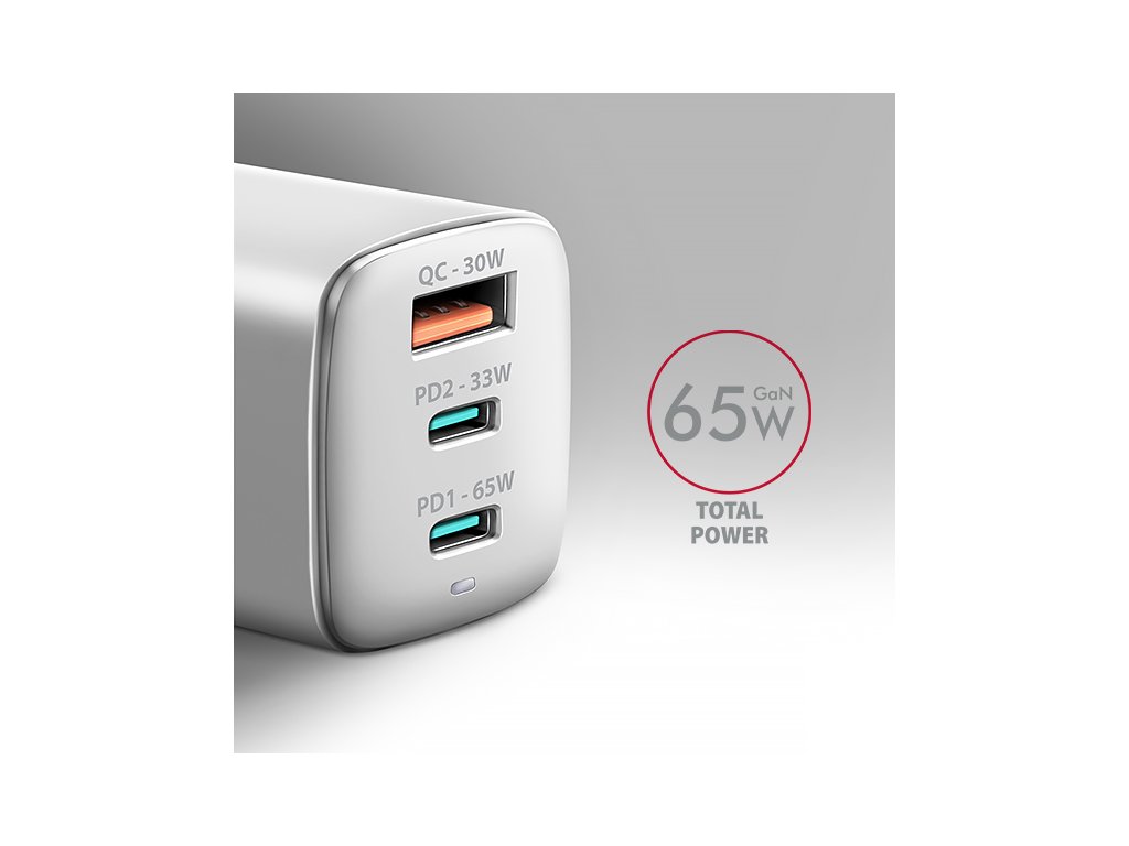 Cestovní nabíječka do sítě AXAGON ACU-DPQ65W GaN umožňuje rychlé nabíjení až tří mobilních zařízení současně. Díky celkovému výkonu 65W dokáže nabíječka dobíjet notebooky, telefony a další mobilní zařízení nejvyšší možnou rychlostí. Adaptér nabízí nejen standardní USB-A konektor, ale také dva oboustranné USB-C konektory.Kompaktní velikost a vysoký výkon je daný využitím nové GaN technologie. Použité součástky s Nitridem Galia pracují s vysokou účinností, což umožňuje dosahovat vysokých výkonů při malé velikosti. Nabíječka je vybavena dvěma výstupy Power Delivery 3.0 / Quick Charge 4+ USB typu C a jeden Quick Charge 3.0 USB typu A, což umožňuje rychlé nabíjení nejen smartphonů a tabletů, ale také notebooků.