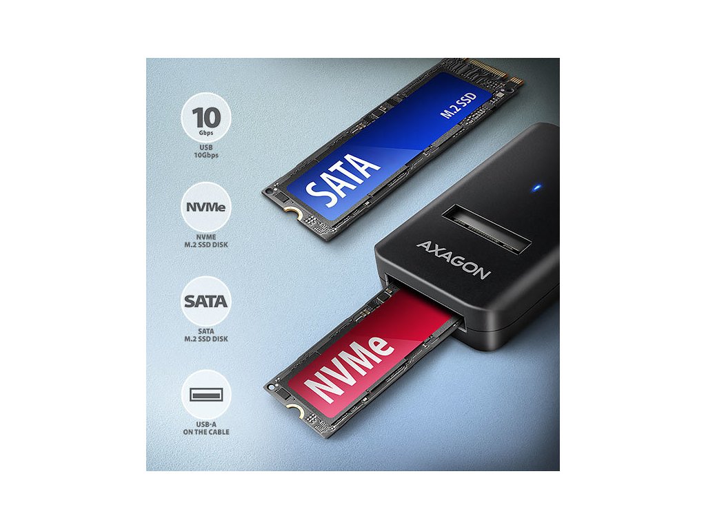 Kompaktní AXAGON ADM2-AM M.2 adaptér s USB 10Gbps rozhraním určený pro snadné použití M.2 NVMe nebo SATA SSD disků. Spolehlivé připojení k počítači umožňuje napevno uchycený USB-A kabel délky 10 cm.Díky USB 3.2 Gen 2 rozhraní je přenosová rychlost až 10 Gb/s. Druhá generace rychlého USB rozhraní dovolí užívat si rychlost moderních M.2 SSD disků. Univerzální M.2 adaptér podporuje i další moderní funkce např. UASP, TRIM a umožňuje čtení S.M.A.R.T. informací monitorujících stav disku. Podpora úsporného režimu při nečinnosti.