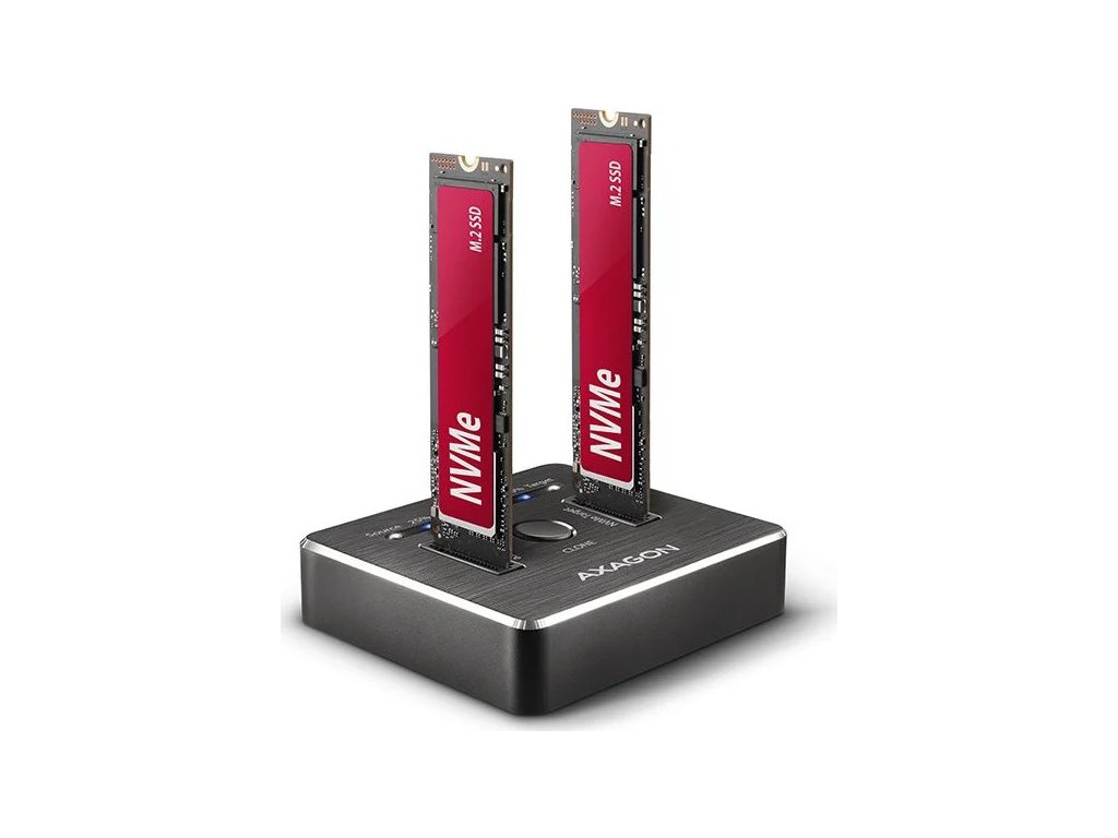 SuperSpeed USB-C 10 Gbps dokovací stanice AXAGON ADSA-M2C DUAL NVMe CLONE MASTER DOCK připojí k počítači snadno a rychle až dva NVMe (PCI-Express) M.2 SSD disky. Pohodlné připojení umožňuje oboustranný USB-C konektor. V balení naleznete rovnou dva kabely pro připojení dokovací stanice - klasický kabel USB-C -> USB-A a také USB-C -> USB-C kabel.Tento malý pomocník vám umožní nejjednodušší a nejrychlejší způsob připojení až dvou libovolných NVMe M.2 SSD disků k počítači. M.2 kartu jen vezmete a zasunete do základny, nejsou potřeba žádné nástroje ani doplňky. Výměna M.2 SSD disků je tak velmi rychlá a lehká.