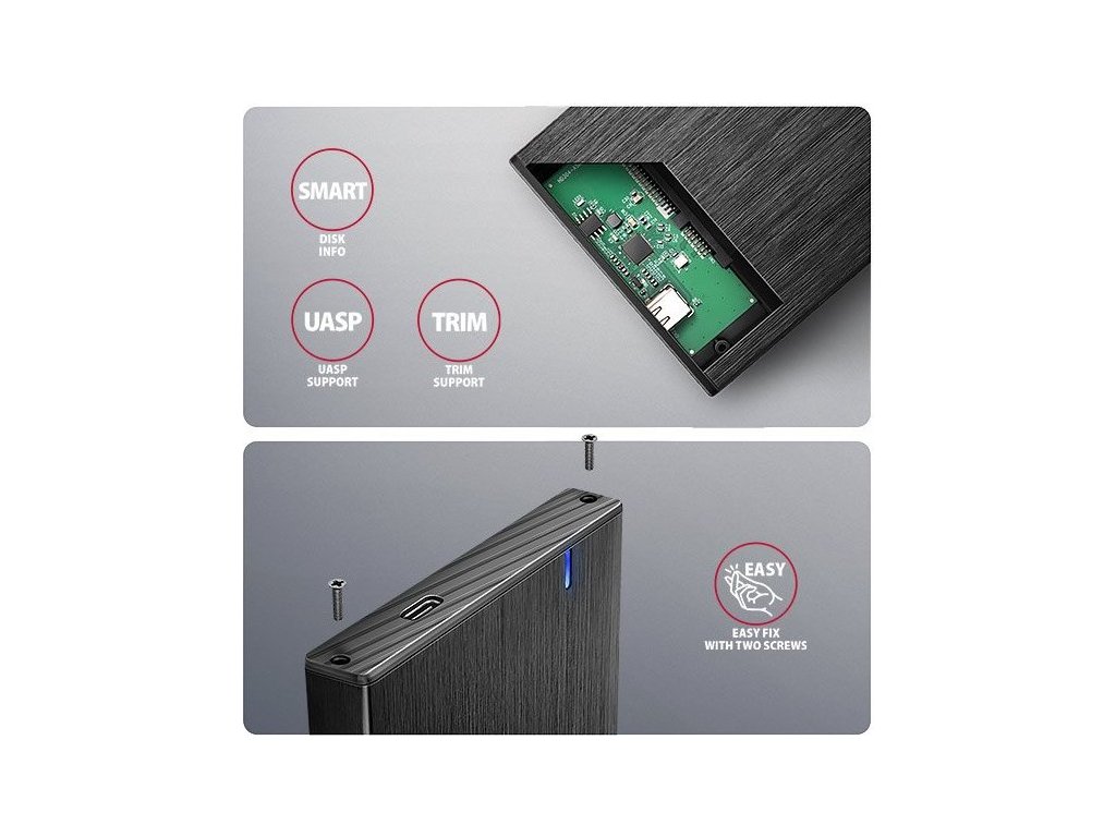 Kompaktní hliníkový externí AXAGON EE25-XA6C ALINE box s USB-C 5Gbps rozhraním určený pro 2.5" SATA pevné disky nebo SSD. Spolehlivé připojení k počítači umožňuje oboustranný USB-C konektor na boxu spolu s dodávaným kabelem USB-C -> USB-A.Díky SATA 6G rozhraní s podporou UASP dovolí užívat si rychlost moderních SSD disků. Podpora funkce TRIM pro omezení pozvolné degradace výkonu SSD v čase. Čtení S.M.A.R.T. informací monitorujících kondici externího disku. Podpora uspávání připojeného disku i boxu.