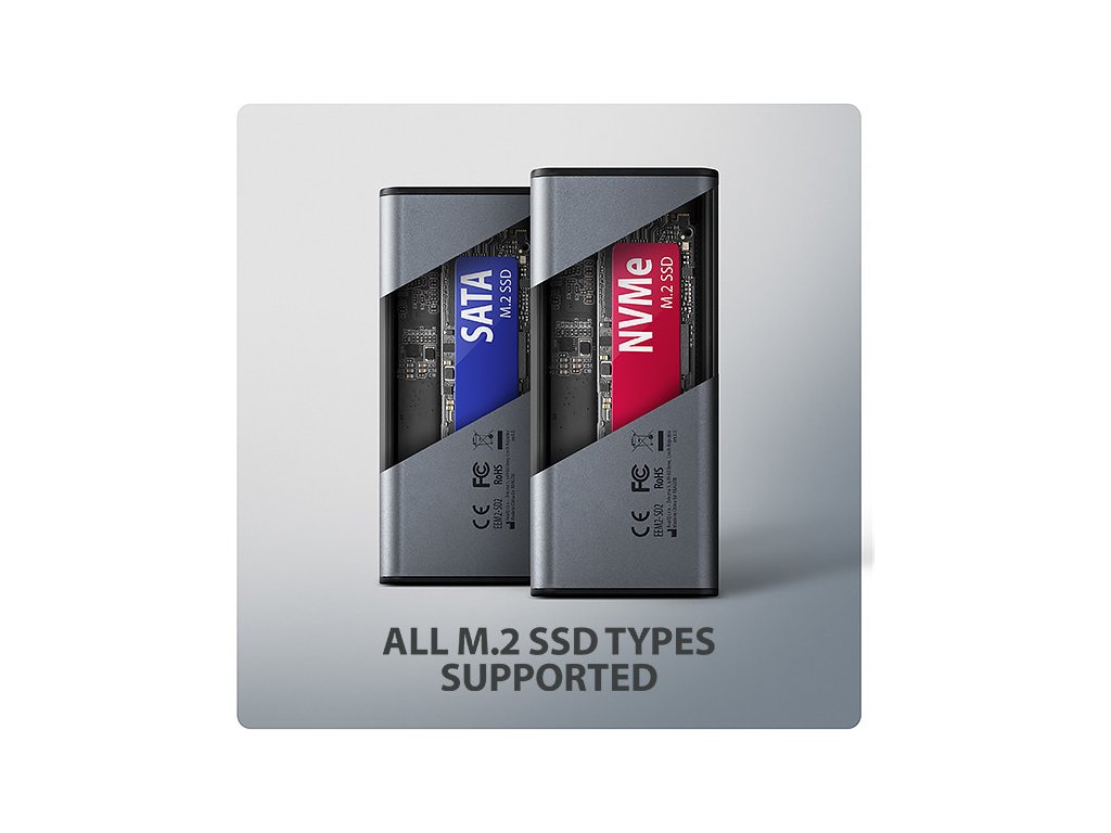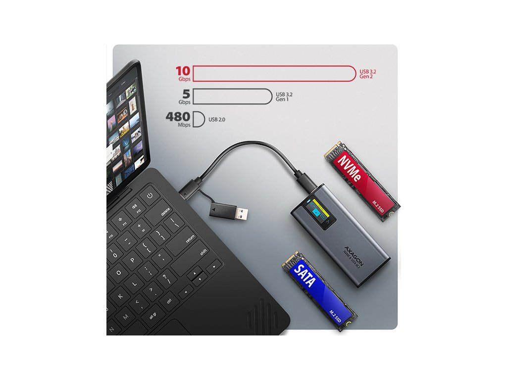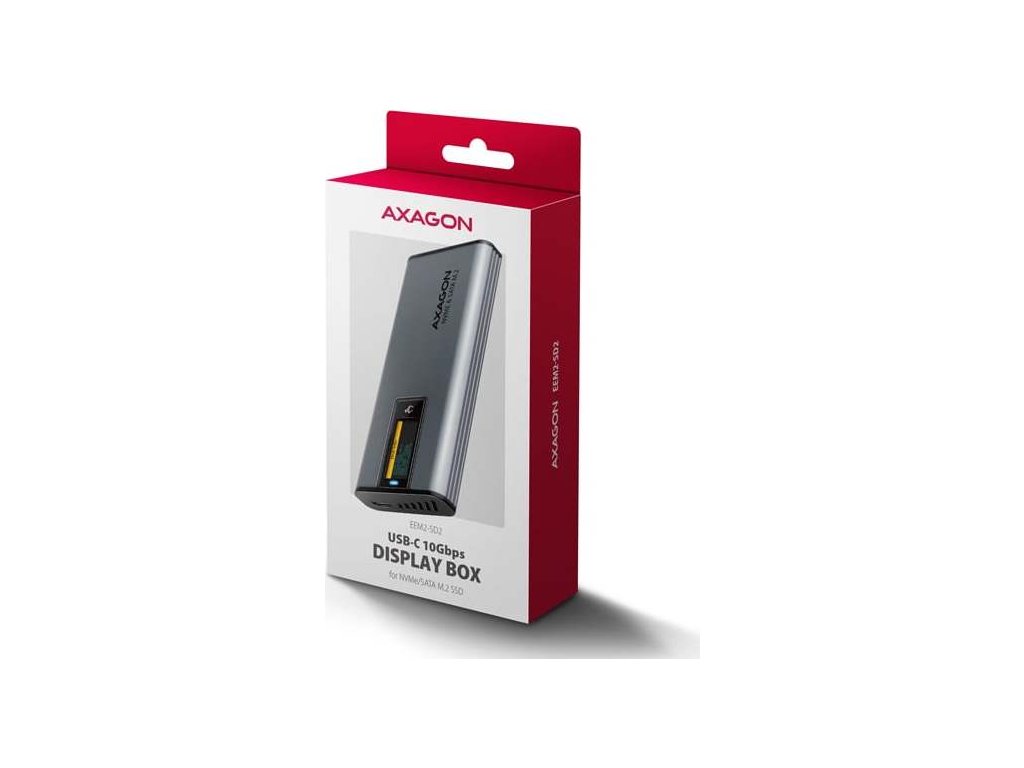 AXAGON EEM2-SD2 USB-C 10Gbps - M.2 NVMe & SATA SSD kovový DISPLAY box, bezšroubkový