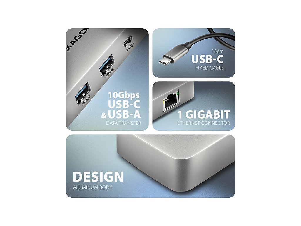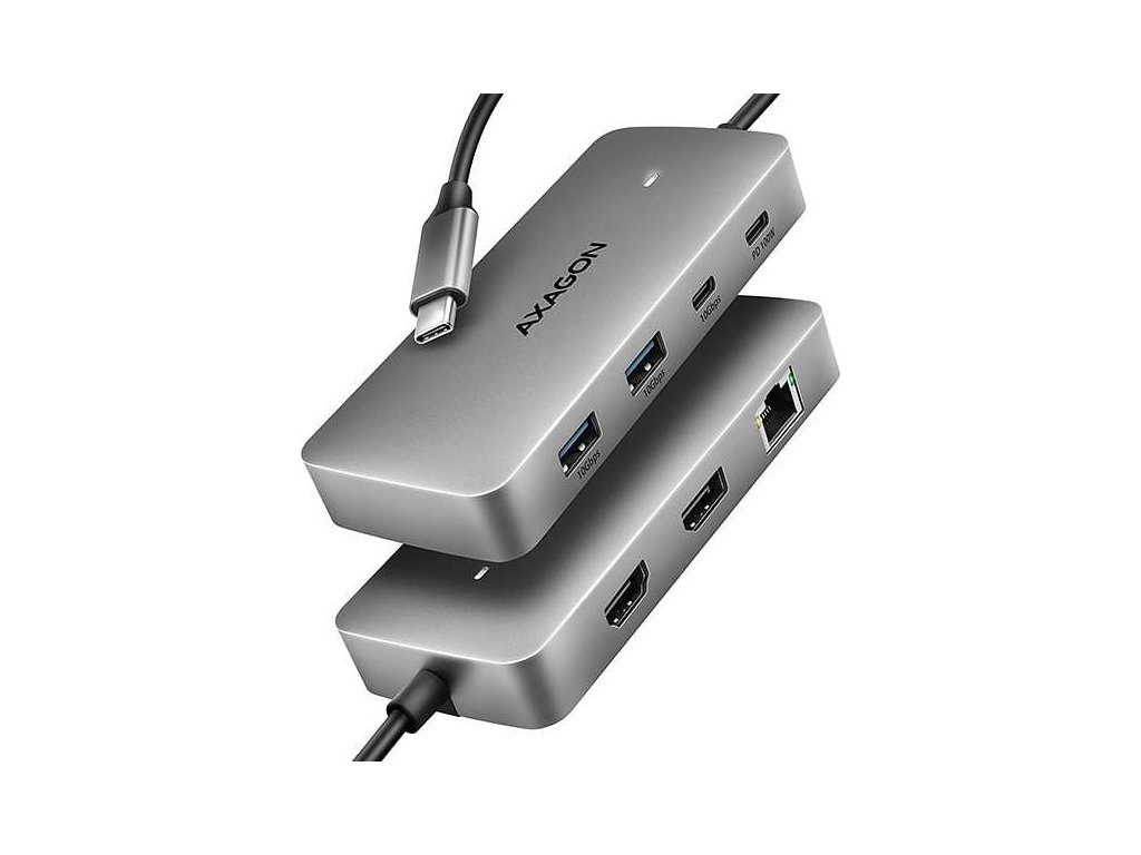 AXAGON HMC-CUB83X2, USB 10Gbps hub, 2x USB-A, USB-C, HDMI & DP 4k/144Hz, RJ-45 GLAN, PD 100W, kabel USB-C 15cm