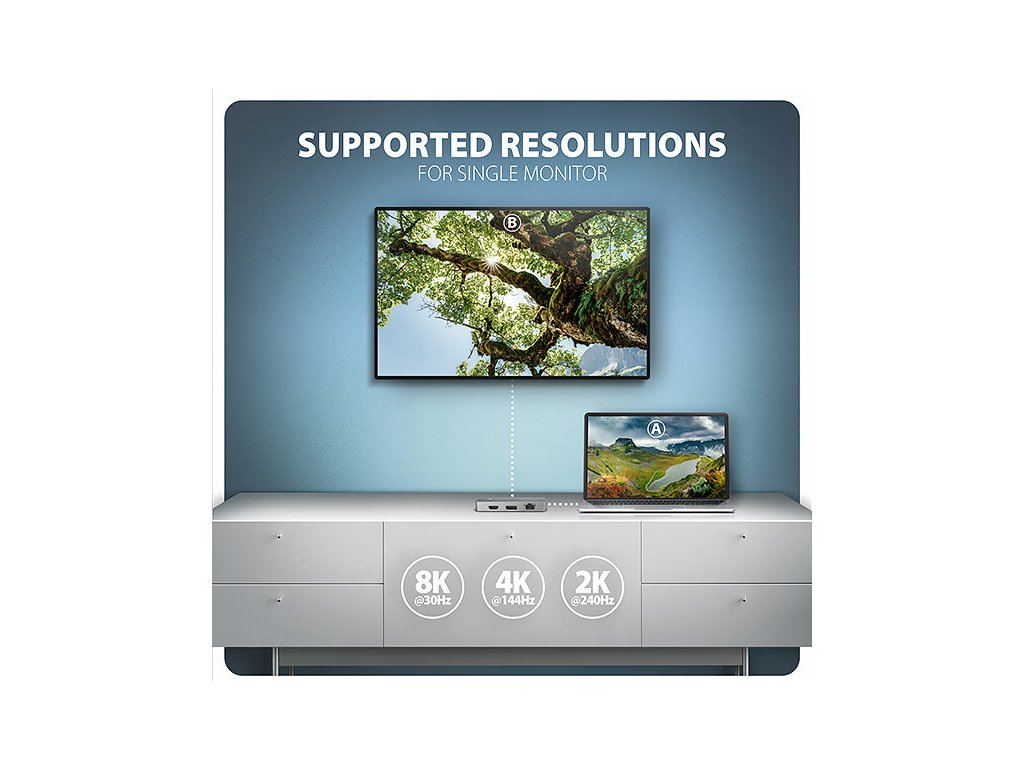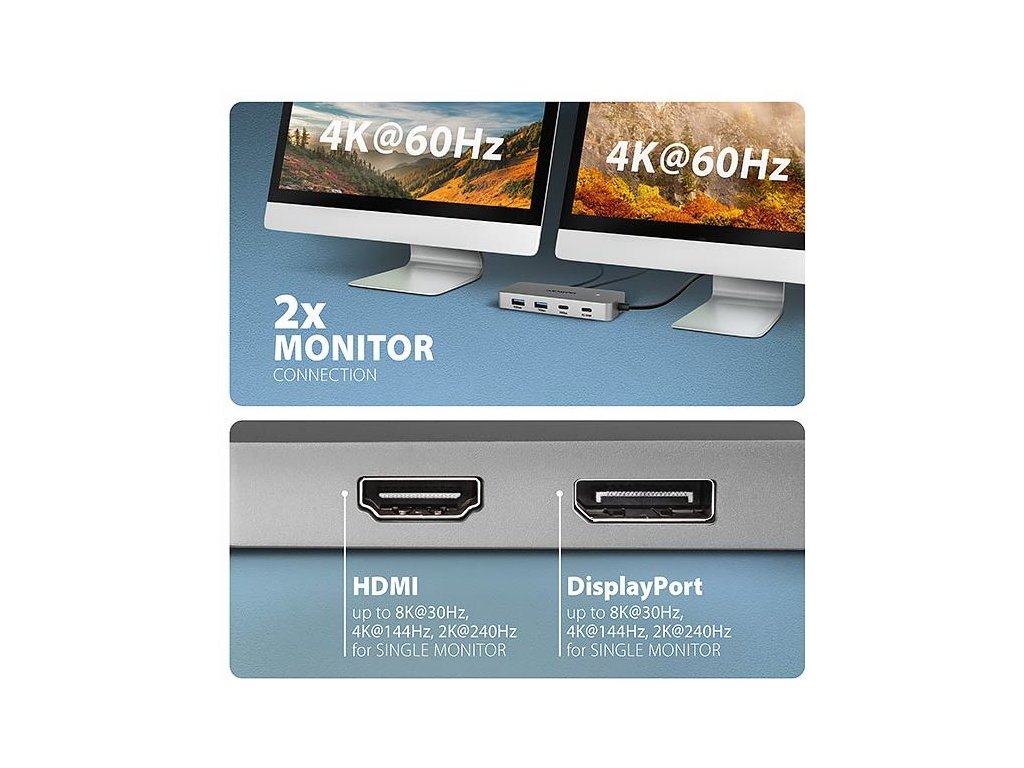 Dokovací stanice nabízí dva video výstupy – HDMI a DisplayPort umožňují připojení externích monitorů, televizorů nebo projektorů s rozlišením až 8K/30Hz Ultra HD. Podporována jsou také další rozlišení, například 4K/144Hz Ultra HD, 2K/240Hz Quad HD nebo 1080p/240Hz Full HD a přenos vícekanálového zvuku přes HDMI. Při současném zapojení dvou monitorů poskytuje rozlišení 4K/60Hz na každém z nich. Díky podpoře HDR (High Dynamic Range) si uživatelé mohou vychutnat výrazně širší rozsah barev a vyšší kontrast, což ocení při práci i zábavě.