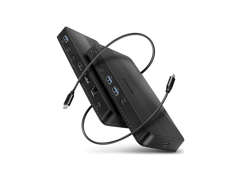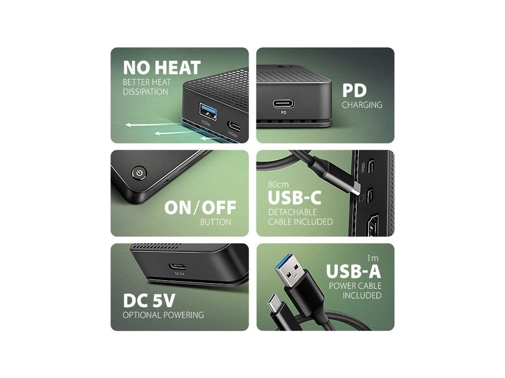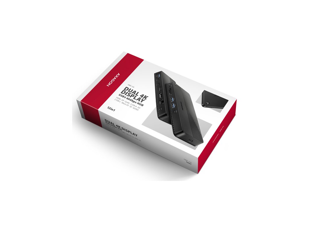 AXAGON HMC-U4 DUAL 4K DISPLAY dock promění Váš notebook, tablet nebo telefon na multimediální centrum. Díky nejmodernější technologii USB4 nabízí tato dokovací stanice celkovou datovou propustnost až 40 Gbps. Můžete tak plně využít i to nejnáročnější počítačové příslušenství a užít si špičkový zážitek. Ať už sledujete video v 8K rozlišení, nebo pracujete se dvěma 4K monitory současně, tato technologie vám zajistí potřebný výkon. USB4 nabízí výhodu kompatibility s technologií Thunderbolt a zároveň podporuje zpětnou kompatibilitu s předchozími generacemi USB. Notebook připojíte k dokovací stanici 12in1 přes dodaný 80 cm dlouhý kabel. V okamžiku tak máte k dispozici rychlou čtečku SD i microSD karet a konektory pro připojení dvou externích monitorů, pětici USB zařízení, sluchátek nebo headsetu a Power Delivery napájení. Je však nutné, aby USB-C port vašeho zařízení podporoval video výstup (DisplayPort Alternate Mode) a Power Delivery napájení. HDMI a DisplayPort výstupy vám umožňují připojit externí monitor, TV nebo projektor s rozlišením až 8K/30Hz Ultra HD, 4K/144Hz Ultra HD nebo 2K/240Hz Quad HD a to s podporou přenosu vícekanálového zvuku. Díky podpoře HDR si můžete vychutnat bohatší barevné spektrum a výraznější kontrasty pro ještě lepší vizuální zážitek. Připojením dvou monitorů současně, získáte rozlišení až 4K/144Hz na DP port výstupu a 4K/60Hz na HDMI výstupu. Veškerá podporovaná rozlišení a vlastnosti jsou přímo závislá na podpoře připojeného monitoru a notebooku. Dokovací stanice disponuje třemi 10Gbps výstupy USB-C a USB-A a dvěma 5Gbps výstupy USB-A. Tato pětice USB portů umožňuje připojení externích disků, flash disků, myši, tiskárny a dalšího USB příslušenství. USB porty také nabíjí mobilní telefony a tablety výkonem až 7.5W. Čtečka paměťových karet podporuje čtení a zápis všech verzí SD (UHS-II) a microSD (UHS-I) karet s kapacitou až 2TB. UHS-II karty dosahují rychlosti až 156 MB/s (full-duplex) resp. 312 MB/s (half-duplex), podpora starších UHS-I karet (max rychlost 104 MB/s) je samozřejmostí. Card reader umožňuje současnou práci s kartami v obou slotech a přímé kopírování mezi nimi. K připojení stereo sluchátek, headsetu nebo aktivních reproduktorů můžete použít zvukový výstup 3.5 mm. Ten je vybaven vysoce kvalitním DAC převodníkem, který podporuje vzorkování až 384 kHz při 24 bitech. Užijete si tak špičkovou kvalitu zvuku, která je ideální pro bezztrátové formáty jako FLAC, WMA, WAV, APE, AAC či ALAC. Gigabitová síťová karta rozšíří počítač o rychlé a stabilní síťové připojení, doplní chybějící síťový RJ-45 Ethernet konektor, nebo přidá další síťovou kartu. USB-C vstup (PD) je určen pro Power Delivery nabíječku. Díky tomu je jak notebook, tak i dock, napájen přímo z PD nabíječky s využitím technologie Power Delivery 3.0 s výkonem až do 100W. S přídavným napájením přes USB-C vstup (DC 5V) můžete posílit napájení, při provozu bez připojené PD nabíječky a k multiportovému hubu připojit i zařízení s vyšší spotřebou energie například více externích disků. Tlačítko na horní straně docku slouží k zapnutí a vypnutí dokovací stanice. Díky promyšlenému designu se čtyřmi gumovými nožičkami zůstane stanice pevně na svém místě. Elegantní vroubkovaný povrch na vrchní části nezanechává otisky prstů. Průduchy na spodní straně zajišťují dostatečnou cirkulaci vzduchu, takže se dock ani při vyšším zatížení nepřehřívá. Vstup (připojení k počítači nebo mobilnímu zařízení): • USB4 40Gbps (USB4 Version 1.0), konektor USB-C female. • Kompatibilní s Thunderbolt 3/4, USB 10Gbps, USB 5Gbps. Vstup (napájení): • USB Power Delivery 3.0 - 100W port (jen napájení), konektor USB-C female (PD). • Napájení PD musí podporovat jak mobilní zařízení, tak síťová nabíječka. • Přídavné napájení pro externí disky připojené přes hub, konektor USB-C female (DC 5V). Doporučený zdroj 5V/2A. Výstupy USB: • 2x USB 5Gbps port, konektor USB-A female. • 1x USB 10Gbps port, konektor USB-A female. • 2x USB 10Gbps port, konektor USB-C female. • USB-C hub zvládne připojení dvou externích disků současně. • Nabíjení mobilních zařízení (včetně iPad) proudem až 1.5A z USB-A portů hubu. Výstupy video: • 1x HDMI port, konektor HDMI A female. • 1x DP port, konektor DisplayPort female. Maximální podporované rozlišení: • Notebook s USB4 40Gbps nebo Thunderbolt 4 portem: • 1 monitor - až 8K/30Hz, 4K/144Hz Ultra HD, 2K/240Hz Quad HD, 1080p/360Hz Full HD • 2 monitory - až 4K/144Hz + 60Hz Ultra HD, 2K/240Hz + 144Hz Quad HD, 2x 1080p/240Hz Full HD • Notebook s USB 10Gbps portem: • 1 monitor - až 8K/30Hz, 4K/144Hz Ultra HD, 2K/240Hz Quad HD, 1080p/360Hz Full HD • 2 monitory - až 2x 4K/60Hz Ultra HD, 2x 2K/144Hz Quad HD, 2x 1080p/240Hz Full HD Vlastnosti videa: • Kompatibilní také se zařízeními s Thunderbolt 3 porty. • U zařízení Apple s macOS je maximální obnovovací frekvence většinou omezena na 60Hz. • Pro dosažení maximálních hodnot rozlišení a frekvencí na video výstupech je nutné dock zapojit do USB-C portu s podporou DisplayPort Alternate Mode (DP Alt Mode) verze min. 1.4 nebo do USB-C portu s podporou min. Thunderbolt 4. Dále je nutný vhodný aktualizovaný OS a aktuální grafické ovladače. • Podpora HDR (High dynamic range, 10 bit support) - realistická reprodukce světlých a tmavých detailů. • Podpora HPD (Hot-Plug-Detect). • Podpora TMDS (Transition Minimized Differential Signaling). • Plná podpora HDCP 1.4 a 2.3 (High-bandwidth Digital Content Protection). • Podpora až 8kanálového LPCM zvuku, komprimovaného audia (AC-3, DTS) a HBR aud