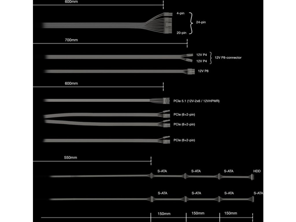 Napájecí konektory: 1× ATX 20+4pin, 1× PCIe 5.1 (600 W), 1× EPS 4+4pin, 1× EPS 8pin, 3× PCIe 6+2pin, 7× SATA, 1× Molex