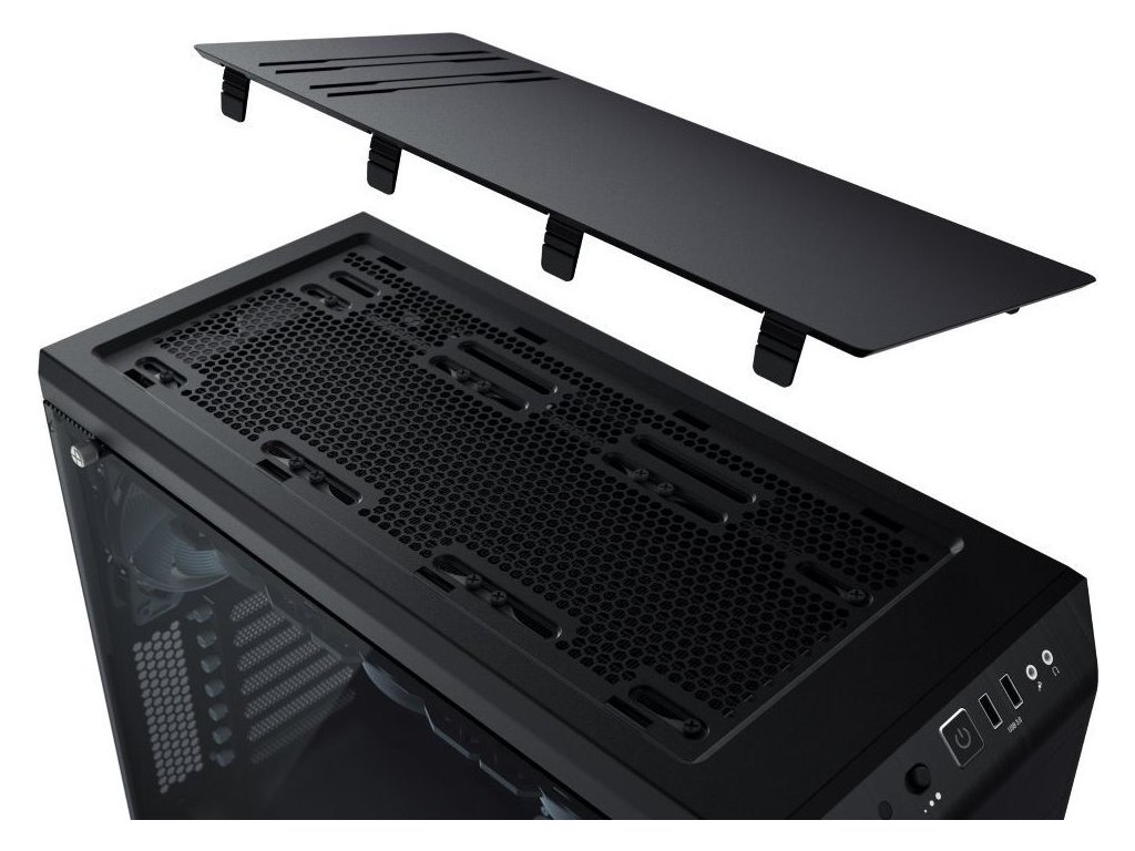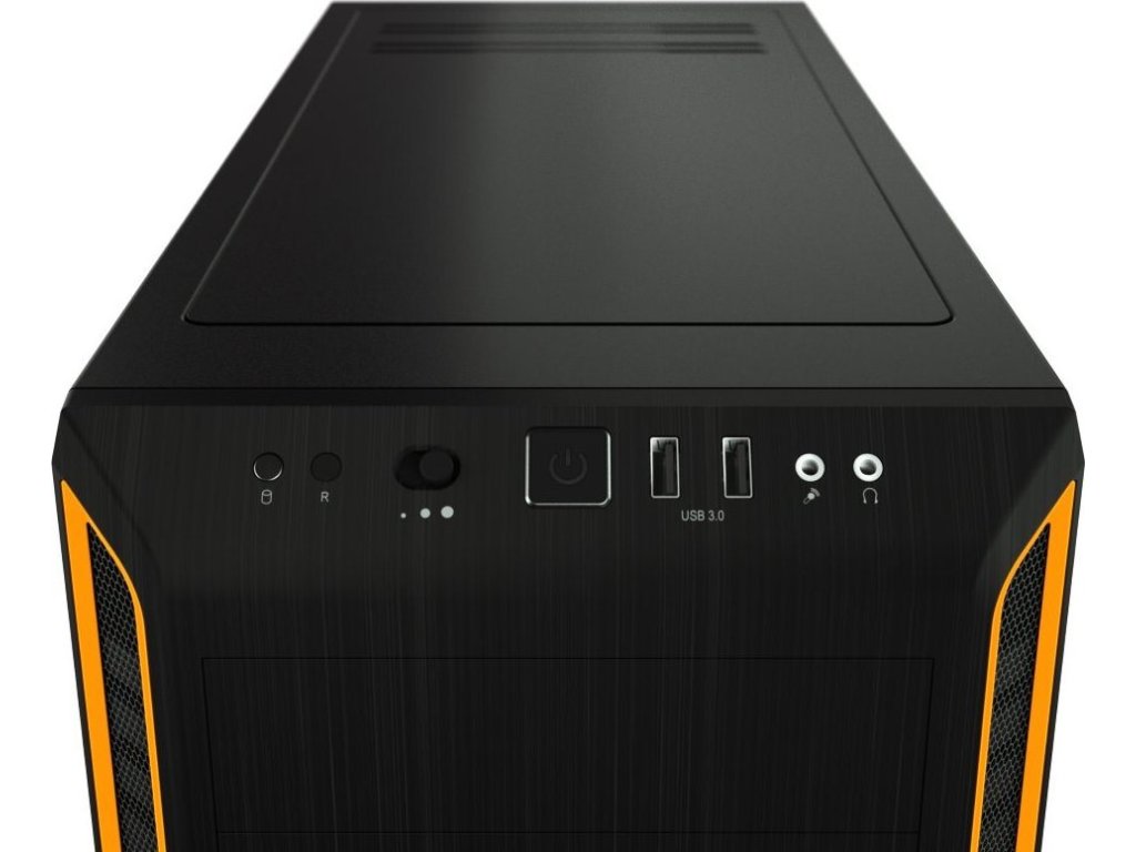 Konektory na horním panelu: 2 x USB 3.0, 1 x výstup pro sluchátka, 1 x vstup mikrofonu, regulátor otáček ventilátorů,