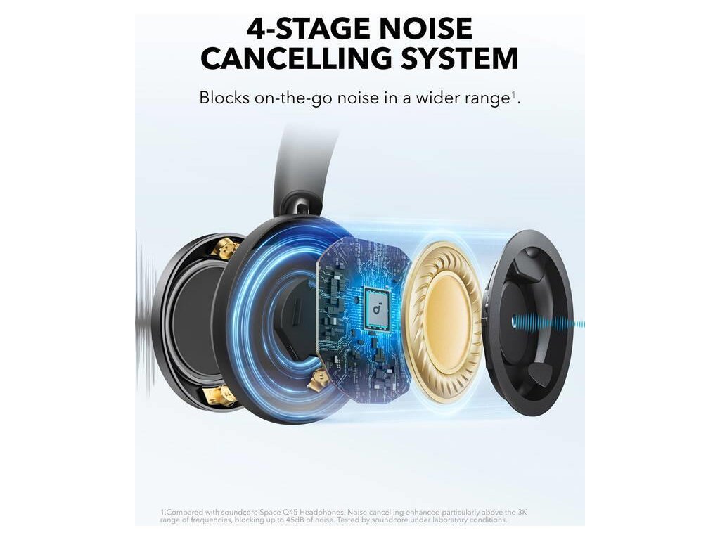 Soundcore-Engineered FlexiCurve Structure: Díky svému super skládacímu designu zmenšuje velikost Space One Pro o 50 %.Space One Pro je vybaven čelenkou s pěti flexibilními segmenty pro optimalizované a přesné skládání a pro vaši jistotu prochází 10 000 testy odolnosti. Každý segment udržuje úhel skládání 5-8 stupňů, což je optimální pro zamezení nadměrného otáčení čelenky. Space One Pro má tři klouby spojující hlavový most a náušníky, které se otáčí až o 180° pro úsporu místa.