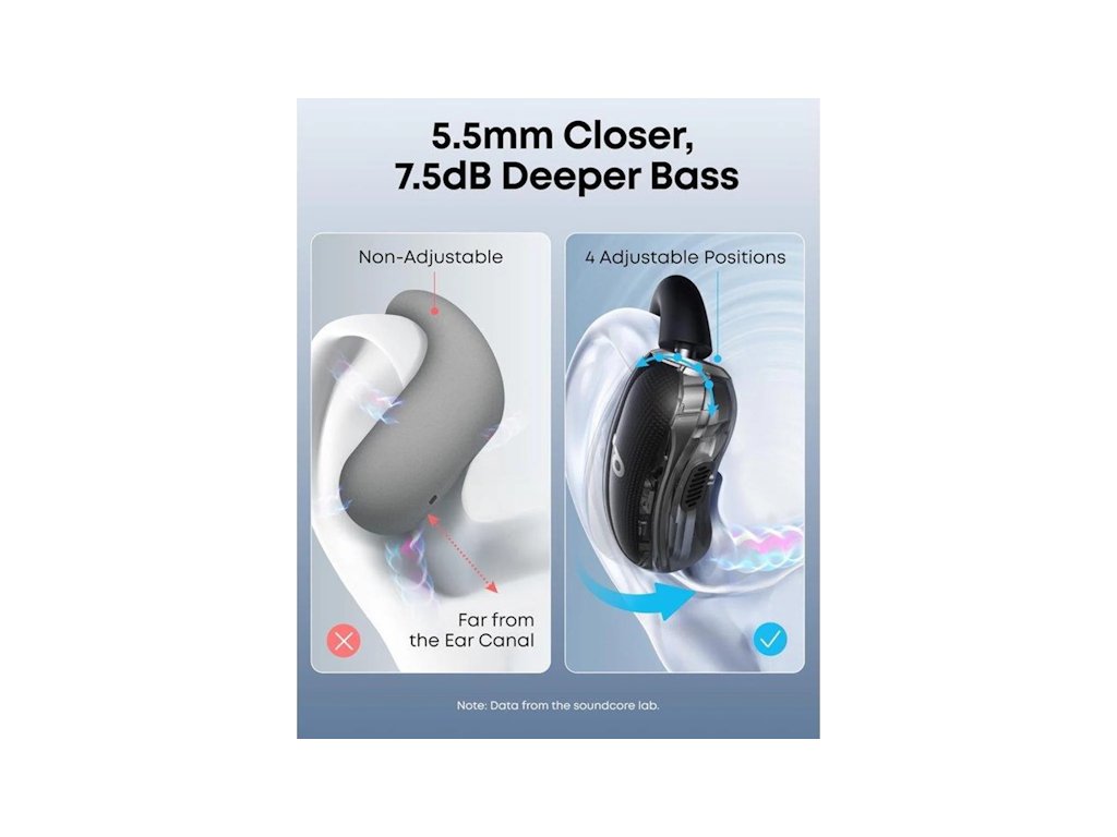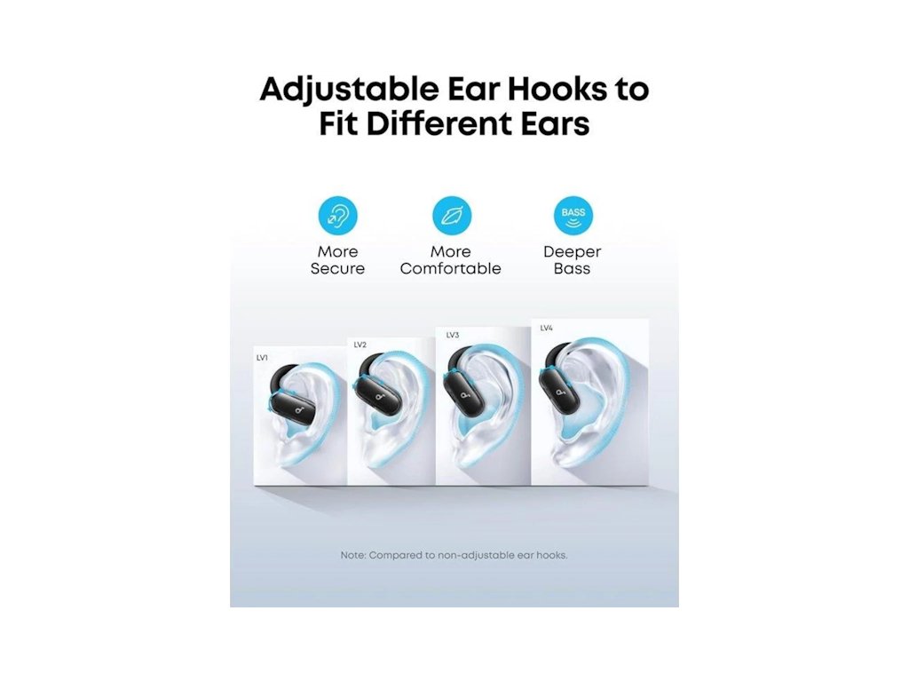 Perfektně padnou do každého ucha: Inovativní čtyřúrovňově nastavitelné ušní háčky Soundcore zajišťují pohodlné nošení přizpůsobené více než 99 % tvarů a velikostí uší.