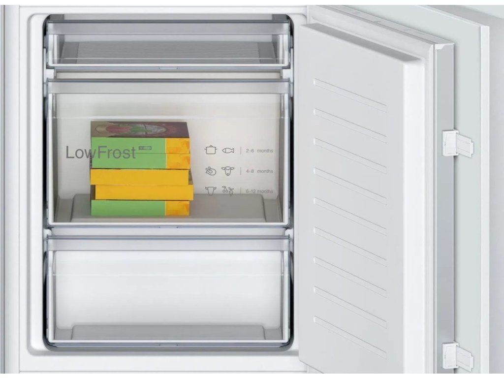 Bosch KIV86NSE0Vestavná chladnička Bosch KIV86NSE0 nabízí velký chladicí objem 183 l a mrazicí 84 l. Technologie LowFrost se stará o rychlejší odmrazování díky redukované tvorbě ledu. Pro ideální uskladnění ovoce a zeleniny zde najdete velkou zásuvku MultiBox s vlnitým dnem. Funkce SuperMrazení zajistí kvalitní zmrazení nově vložených potravin a tím nabízí ochranu již zmrazeným potravinám.