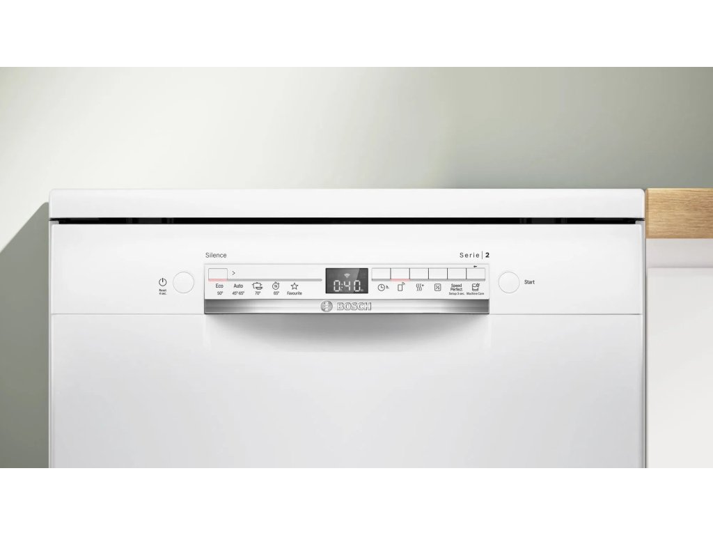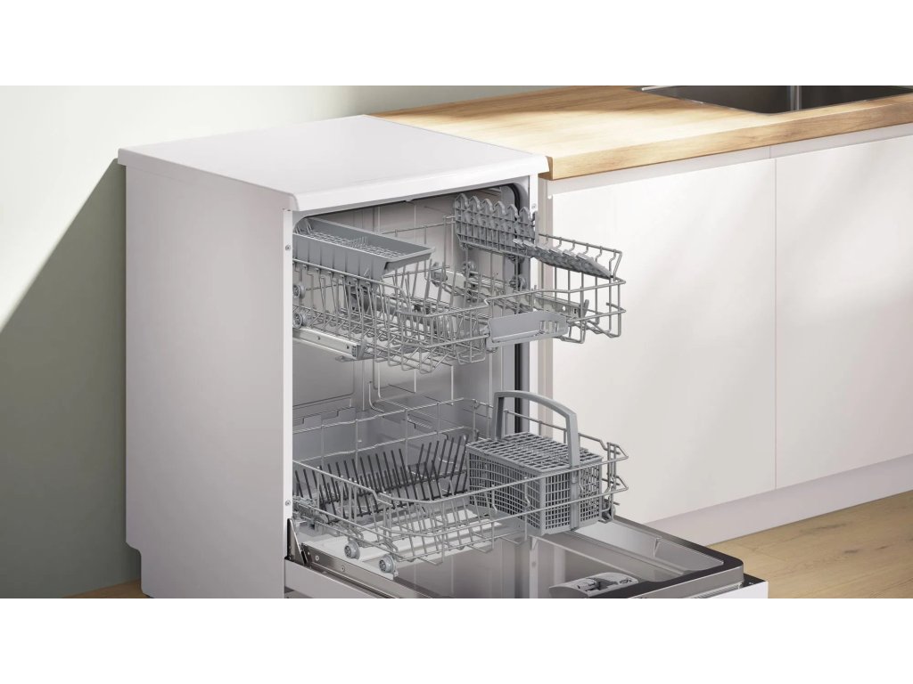 Bílá volně stojící myčka Bosch SMS2ITW09E zvládne umýt až 13 jídelních souprav, které flexibilně naskládáte do košů Vario. Pro příbory je v dolní části určen speciální koš. Horní koš je možné nastavit do 3 výškových poloh díky systému Rackmatic. Volit lze z 5 programů mytí. Podpora Wi-Fi připojení a inteligentní komunikace Home Connect dovolují propojení s mobilním telefonem. Díky tomu máte neustále přehled o průběhu mycího programu. Na dálku můžete myčku spustit, nastavit program Hygiena Plus nebo až na 30 min potlačit hluk na minimum s funkcí Silence on Demand. Myčka Bosch v bílém provedení nabízí také speciální volitelné funkce – Vzdálené zapnutí, Extra sušení, Poloviční náplň a SpeedPerfect+.Klíčové vlastnosti: