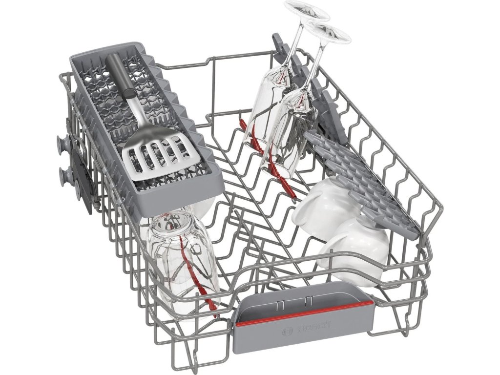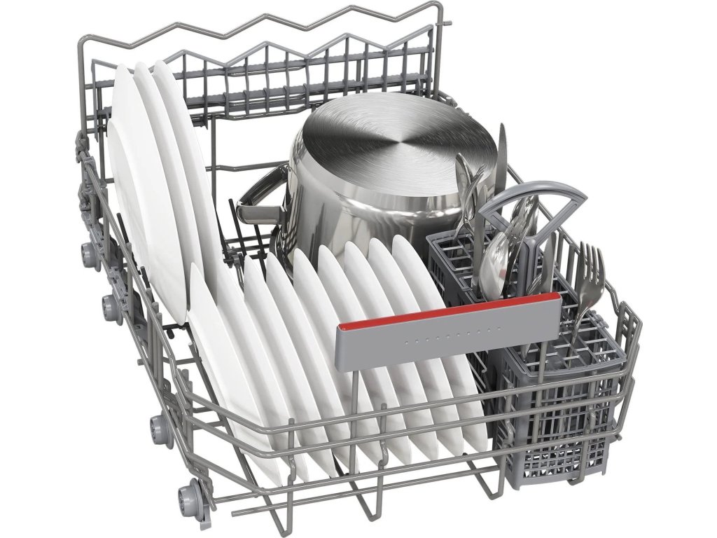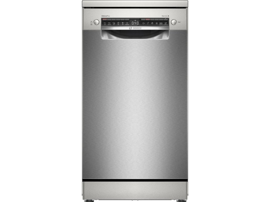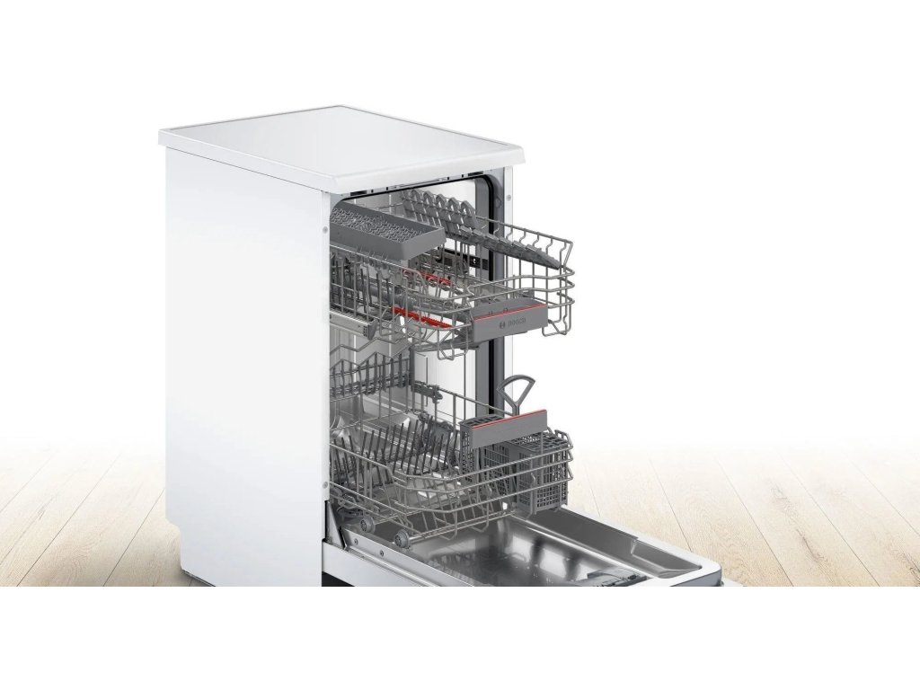Volně stojící myčka Bosch SPS4EKI24E s šířkou 45 cm ideálně zapadne i do menších domácností. Silný a tichý motor EcoSilence Drive pomůže umýt 10 jídelních sad nádobí. Bezpečně vše naskládáte do flexibilních košů VarioFlex a koše na příbory. Systém Rackmatic dovoluje výškově nastavit horní koš. Na konci mycího programu se dveře automaticky pootevřou, nádobí tak perfektně doschne a zároveň ušetříte energii. Pokud spěcháte, urychlete mytí díky SpeedPerfect+. Nastavení všeho potřebného ještě více usnadňuje možnost propojení s mobilní aplikací Home Connect a ovládání na dálku. Skrze tuto aplikaci snadno až 30 min potlačíte hluk na minimum s funkcí Silence on demand. V základní nabídce máte na výběr 6 programů včetně oblíbeného. Spotřebič svým uživatelům nabízí doživotní bezpečnostní systém AquaStop, který chrání myčku proti všem škodám způsobeným vodou.Klíčové vlastnosti: