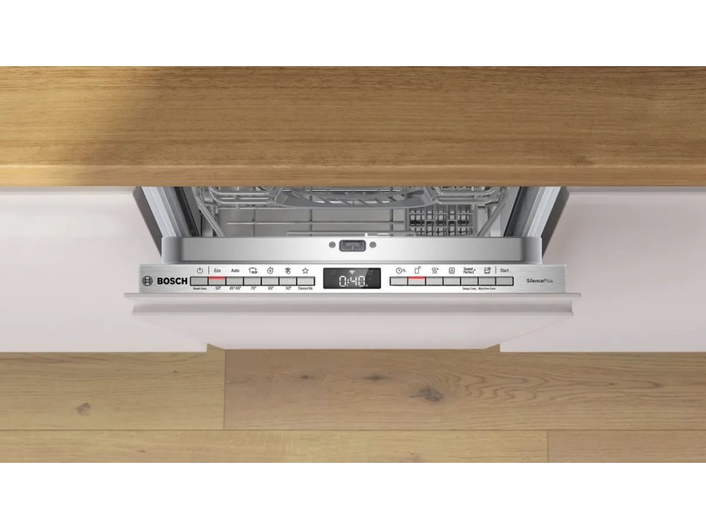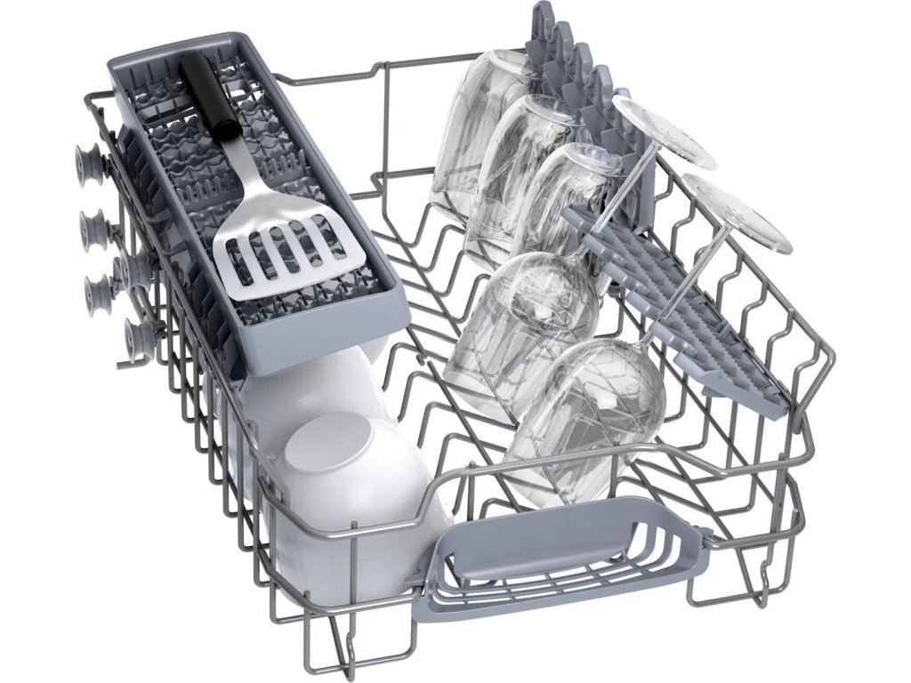 Bosch SPV4HKX10EVolně stojící myčka Bosch SPV4HKX10E s šířkou 45 cm poslouží i v menších domácnostech. Silný a tichý motor EcoSilence Drive pomůže umýt 10 jídelních sad nádobí. Bezpečně vše naskládáte do flexibilních košů Vario a koši na příbory. Pokud spěcháte, urychlete mytí díky SpeedPerfect+. Nádobí se zaschlými zbytky bude dokonale čisté při využití funkce Intensive Zone. O průběhu mytí jste informování světelným paprskem promítaným na podlahu.