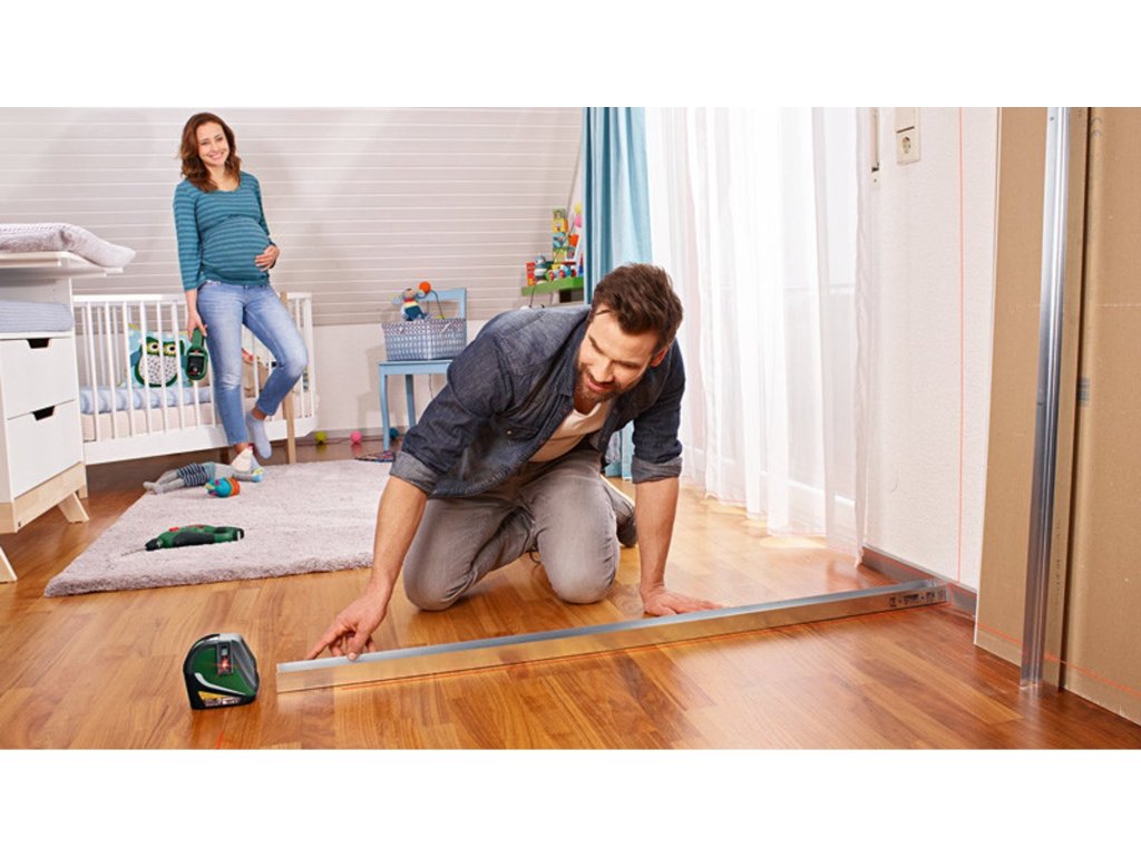 Všestrannost: Laser promítá červenou křížovou čáru s úhlem rozevření 120°. Díky funkci kolmého paprsku navíc usnadní přesné přenesení bodu z podlahy na strop.