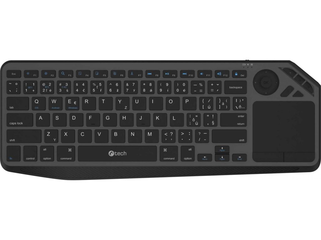 C-TECH WLTK-02 – Chytrá bezdrátová klávesnice s touchpadem a duálním připojením pro moderní domácnost i kancelářObjevte pohodlí bezdrátového ovládání s kompaktní a stylovou klávesnicí C-TECH WLTK-02, která je navržena tak, aby splnila požadavky dnešního multimediálního světa. Tato elegantní černá klávesnice s integrovaným touchpadem kombinuje praktičnost, kompaktní rozměry a moderní technologie do jediného zařízení – ideální pro ovládání chytrých televizí, notebooků, tabletů i mobilních zařízení.