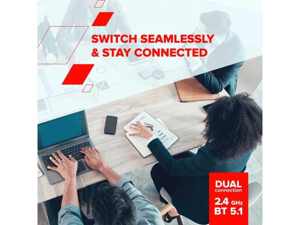 Díky duálnímu připojení (2.4GHz a Bluetooth 5.1) můžete snadno přepínat mezi dvěma zařízeními bez nutnosti znovu párovat. Tichá tlačítka oceníte při práci v tichém prostředí, zatímco vestavěná baterie s kapacitou 500 mAh zajistí dlouhou výdrž bez nutnosti častého nabíjení. Ergonomický tvar a nízká hmotnost zaručují pohodlí i při delším používání.