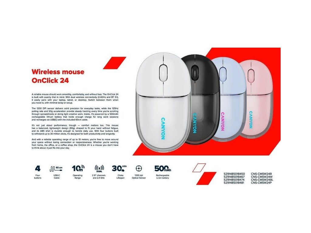 Canyon OnClick 24 – Bezdrátová myš s duálním připojením a tichým chodemHledáte spolehlivou a stylovou bezdrátovou myš pro každodenní práci? Canyon OnClick 24 je ideální volbou pro domácí i kancelářské použití. Nabízí pohodlné ovládání, moderní design a praktické funkce, které vám usnadní každodenní činnosti.