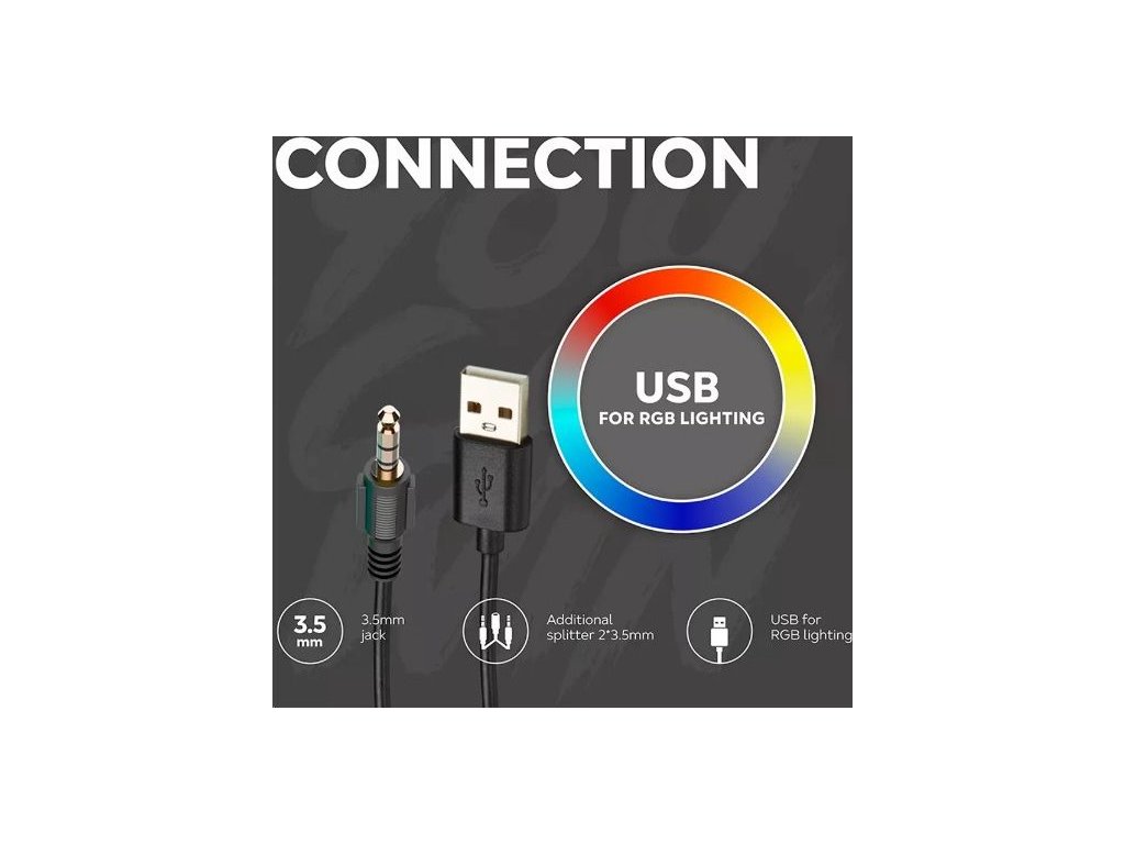 Sluchátka nabízejí možnost dvojího připojení. Nejprve ji zapojte do 3,5mm konektoru nebo použijte rozbočovač pro případ, že potřebujete připojit mikrofon a zvuk zvlášť - ten jsme přidali do balení. Poté připojte kabel USB k počítači, abyste si mohli vychutnat fascinující RGB podsvícení.