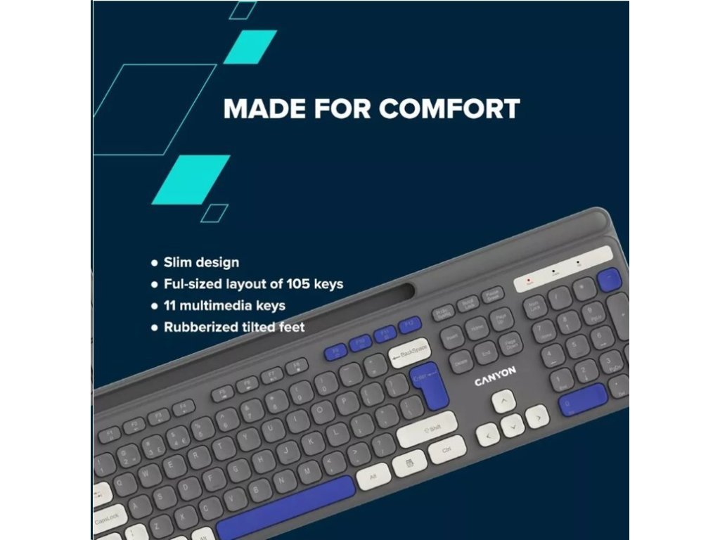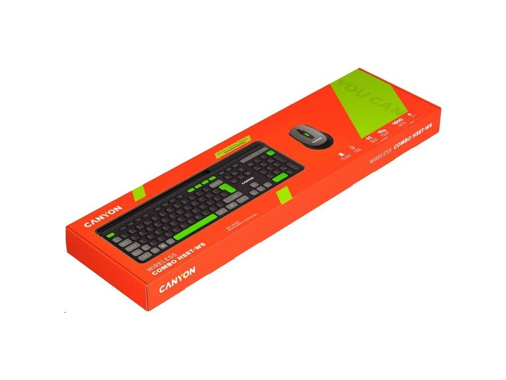 Vstupte do světa bezdrátových kouzel s kombinací klávesnice a myši Canyon! Čeká na vás pracovní prostor bez nepořádku. Klávesnice se stane vaším partnerem pro produktivitu, protože má plnohodnotné rozložení se 105 klávesami včetně multimediálních zkratek, které urychlí váš pracovní proces. Spínače s nůžkovým mechanismem zajišťují tiché psaní, takže se můžete soustředit na své úkoly bez nepříjemného klapání. Tyto spínače jsou také odolné, mají životnost 10 milionů stisknutí. Díky ergonomickému rozložení je psaní na této klávesnici jako hračka. Součástí setu je myš, která má tiché spínače a hezký design. Její na dotek měkký pogumovaný povrch je odolný a šetrný k vaší dlani. Je vybavena šesti tlačítky s nastavitelným DPI. Tento set Canyon je napájen standardními alkalickými bateriemi a je vždy připraven k akci. Vyzkoušejte tři jedinečné barevné kombinace, kdy myš vždy ladí s klávesnicí. Užívejte si svobody s bezdrátovou kombinací Canyon HSET-W5!