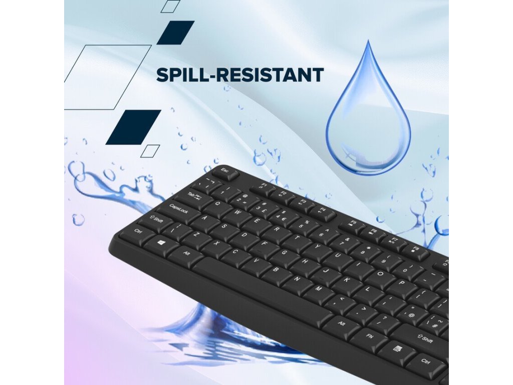 Klávesnice má klasické rozložení se 104 klávesami a je navržena pro dlouhou životnost – až 10 milionů stisků. Díky odolnosti proti polití zvládne i drobné nehody, jako je převržený hrnek s kávou. Myš je symetrická, vhodná pro praváky i leváky, a nabízí citlivost až 1200 DPI pro plynulé a přesné ovládání. Obě zařízení se připojují pomocí 2.4GHz bezdrátového USB přijímače, který zajišťuje stabilní spojení bez zpoždění.