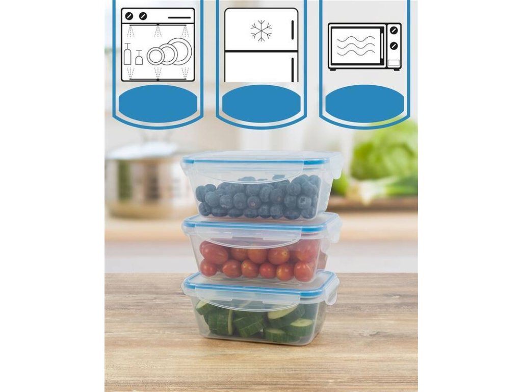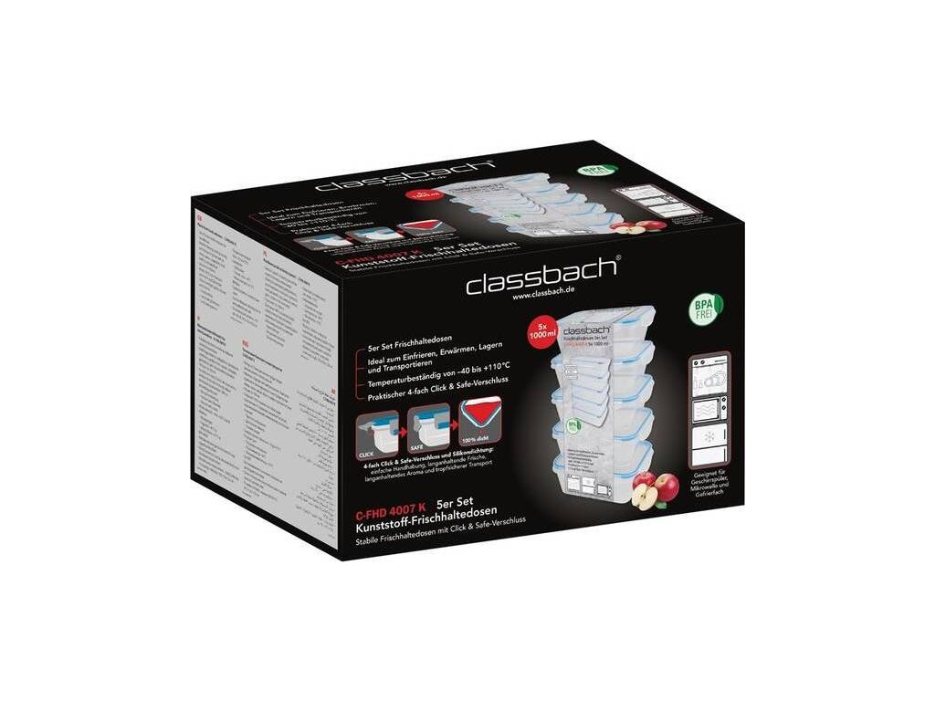 Mějte po ruce stále čerstvé a svěží jídlo, ať už cestujete do práce nebo na víkend na chatu! Nic neudělá větší radost než doma připravené a s láskou uvařené jídlo, které si můžete otevřít v práci stále voňavé a chutné. Praktická sada dóz na potraviny Classbach FHD 4007 o 5 kusech vám zajistí dokonalý požitek z čerstvého jídla.Sada nabízí všestranné využití, od mrazení, ohřevu, skladování až po přepravu na cestách. Můžete v ní uchovávat nejrůznější jídla, jako omáčky, zeleninu, ovoce, vafle nebo třeba dětskou výživu. Dózy udržují jídlo dlouho svěží a zachovávají jeho aroma. Jsou 100 % těsné díky praktickému 4cestnému zapínání Click & Safe a silikonové těsnění ve víku zajišťuje jejich kvalitu. Výhodou je snadná manipulace a vysoká teplotní odolnost od –40 do +110 °C. Můžete je tak bez obav umístit do myčky, mrazáku do –40 °C a mikrovlnné trouby do +110 °C. Nádoby jsou stohovatelné, bez BPA a umožňují snadnou manipulaci díky odnímatelnému těsnicímu víku.