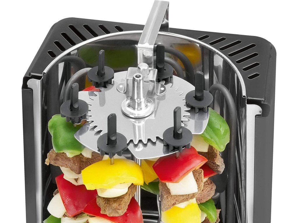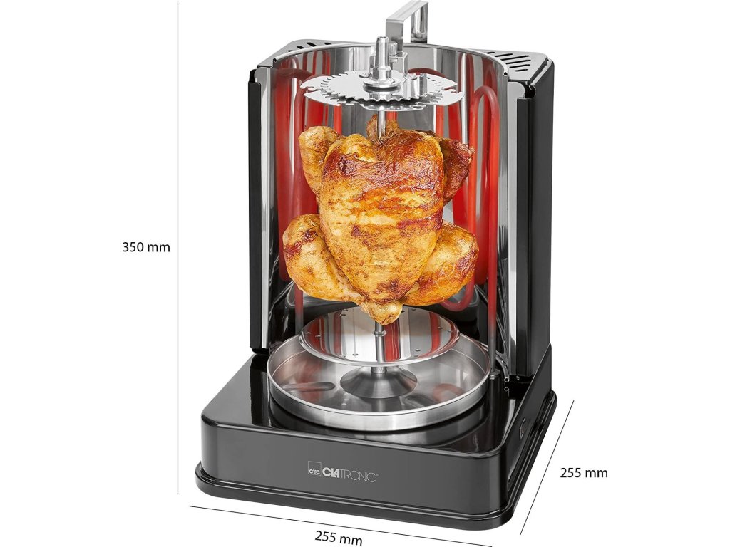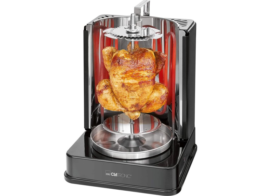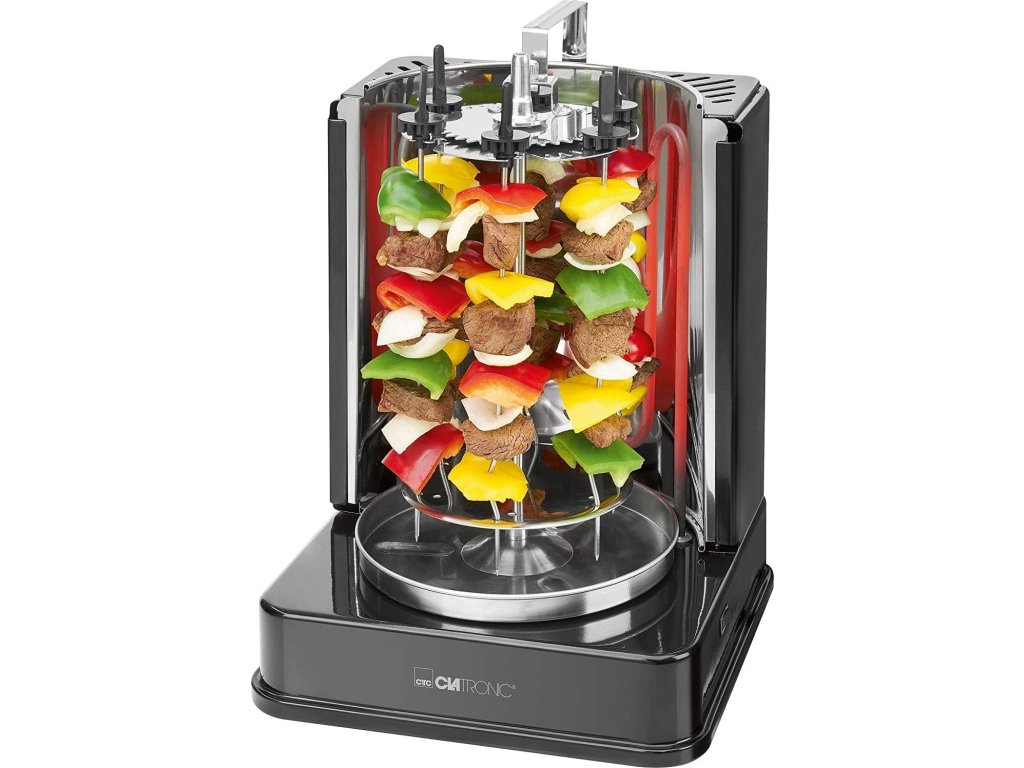 Clatronic DVG 3686 je přístroj, který ukazuje, že grilovat se dá i zdravě, bez použití tuku. Jedná se totiž o otočný vertikální gril, v němž připravované potraviny vůbec nepřichází do kontaktu s jakoukoliv podložkou a pečeny jsou pouze sálajícím horkým vzduchem. Připravovaný pokrm se pochopitelně automaticky otáčí kolem své osy, takže je dokonale a rovnoměrně propečen bez rizika připálení. Veškeré vypečené šťávy, tuk a další tekutiny odkapávají do nerezové sběrné nádoby, z níž je můžete po vychladnutí snadno vylít. Nedochází tak k připékání nečistot na samotný povrch grilu, což zásadním způsobem usnadňuje přípravu.Multifunkční pomocník