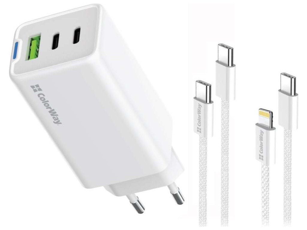 ColorWay 2x USB-C, 1x USB-A/ síťová nabíječka/ GaN/ PD/ PPS/ 65W/ Včetně 2x kabelů, USB-C-USB-C, USB-C-Lightning/ Bílá