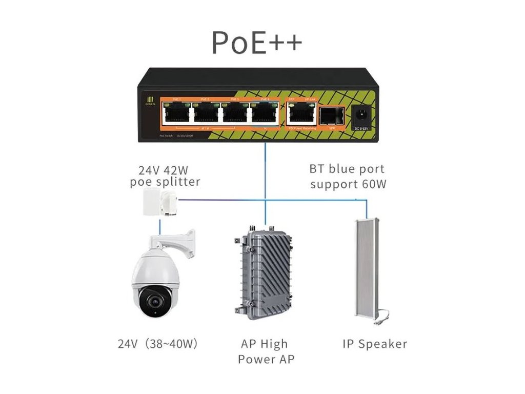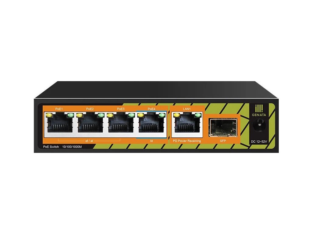 Gigabitový PoE switch v kovovém šasi, bez managementu s 5x Gigabit porty je ideální PoE switch do méně exporovaných míst, například do domácností či firem na okraj sítě pro napájení 4 zařízení (kamer / Wi-Fi AP). Switch nabízí tichý bezventilátorový chod, 5x 10/100/1000 Mbps + 1x Gigabit SFP uplink z čehož 4 LAN porty podporují funci PoE (802.3af/at, 30 W / port, port č.4 podporuje dokonce 802.3af/at/bt - 60 W / port) s celkovým PoE budgetem 60 W. Výhodou tohoto switche je možnost napájení přes PoE-IN na LAN1 nebo DC konektor pomocí zdroje, který není součástí balení. V případě napájení nižšího než 48 V DC napájení bude napájen pouze samotný switch. Pro funkčnost PoE-out portů je potřeba zdroj s napětím 48 až 52 V DC.Klíčové vlastnosti