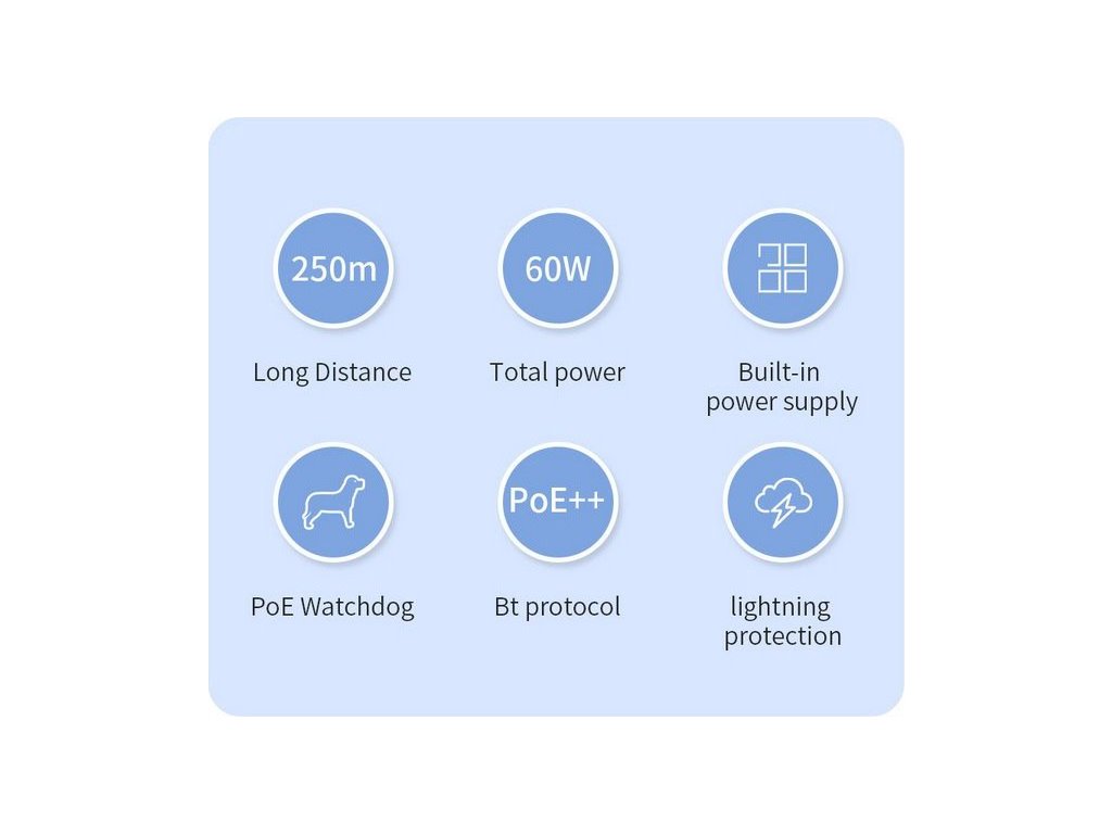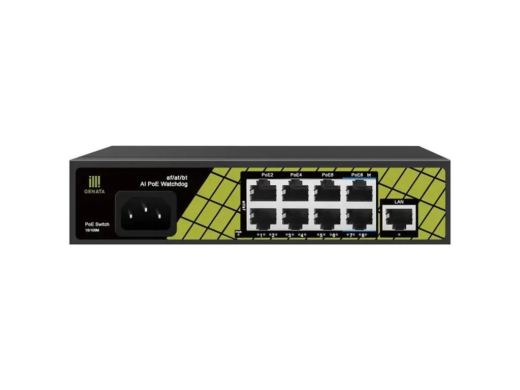 Fast ethernetový kovový PoE switch bez managementu s jedním uplink portem je ideální PoE switch do domácností a rodinných domů pro napájení až 8 zařízení (kamer / Wi-Fi AP) s nízkou spotřebou. Switch nabízí tichý bezventilátorový chod, 9x 10/100 Mbps LAN z čehož 8 ethernetových portů podporuje funkci PoE (802.3af/at, 30 W / port, porty 7 a 8 podporují i 802.3af/at/bt - 60 W / port) s celkovým PoE budgetem 120 W, nízkou vnitřní spotřebou a napájením přes 230V AC konektor díky věstavěnému zdroji. Switch zvládne napájet zařízení až na vzdálenost 250 m při snížení linkové rychlosti na 10 Mbps.Klíčové vlastnosti