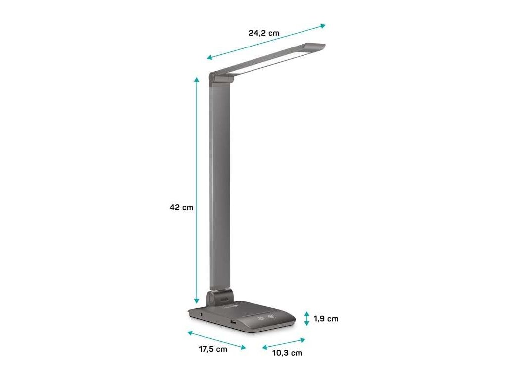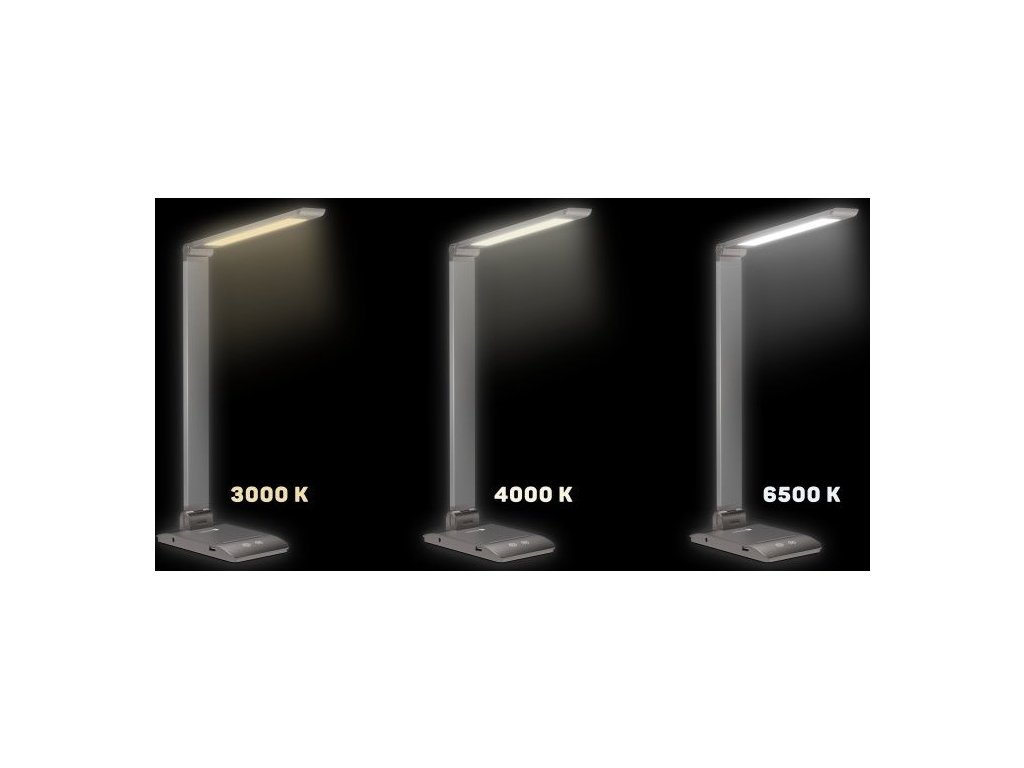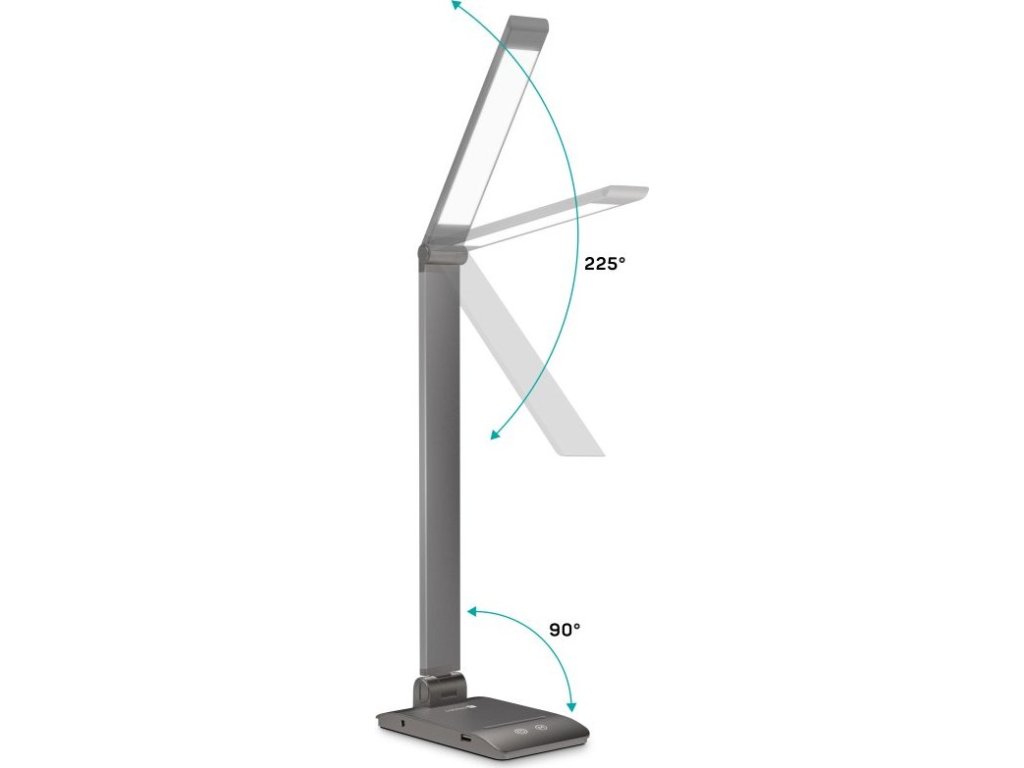 Díky sklopnému rameni a krku nastavíte dokonalý úhel pro jakoukoliv práci. Lampička disponuje USB-A výstupem s výkonem 5 W a dvěma praktickými dotykovými spínači, které umožňují zapnout/vypnout lampu, nastavit 3 úrovně jasu světla nebo nastavit barevnou teplotu světla ve 3 různých úrovních (3000/4000/6500 K).