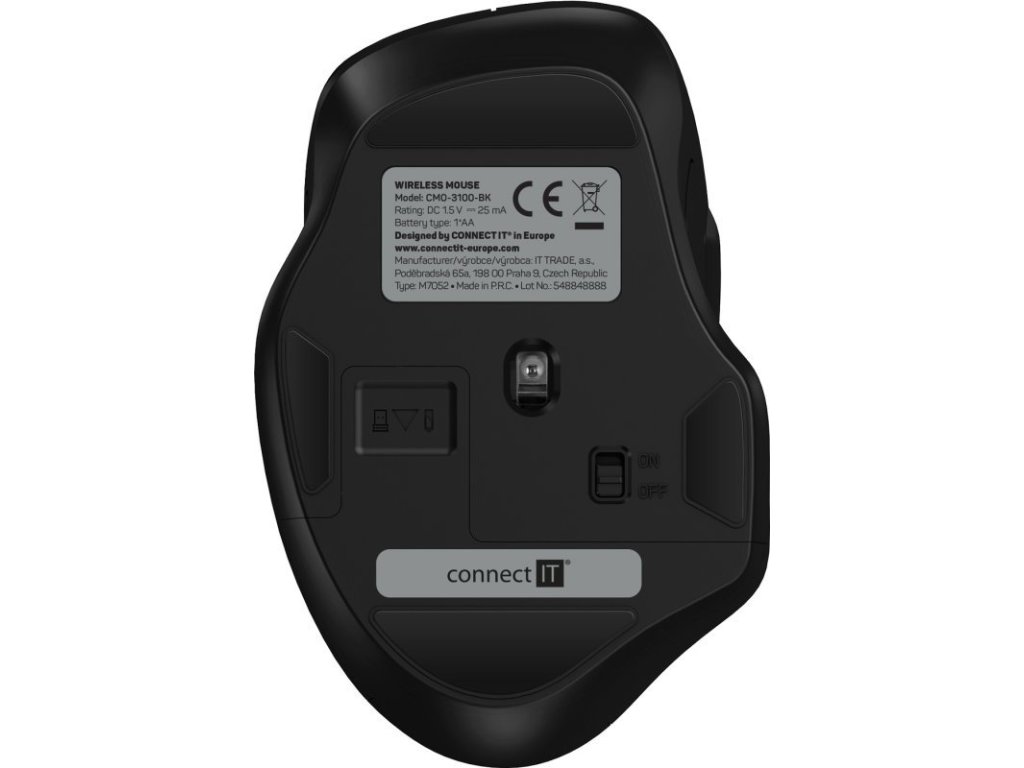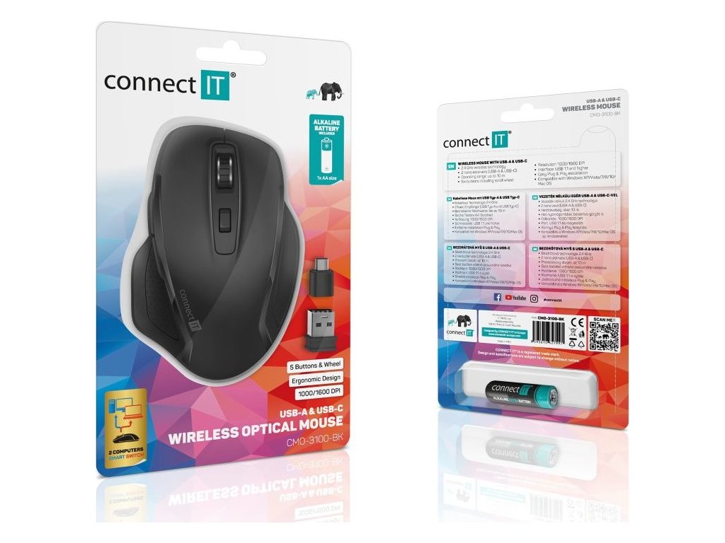 Bezdrátová optická myš s unikátní funkcí SmartSwitch, díky které můžete používat myš střídavě na dvou počítačích nebo noteboocích a libovolně se mezi nimi přepínat. Tato funkce se hodí do domácího i profi kancelářského prostředí, kde se pracuje s jednou myší střídavě na dvou počítačích nebo noteboocích. Jedinečný design myši dovoluje uschovat oba USB Nano příjímače pod krytkou bateriového prostoru ve spodní části myši a zabránit tak jejich ztrátě. Součástí balení je originální alkalická tužková baterie CONNECT IT.
