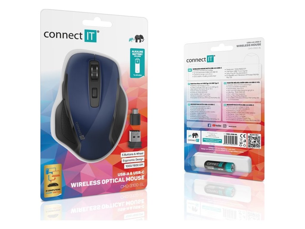 CONNECT IT Dual SmartSwitch bezdrátová myš, USB-A + C, MODRÁ