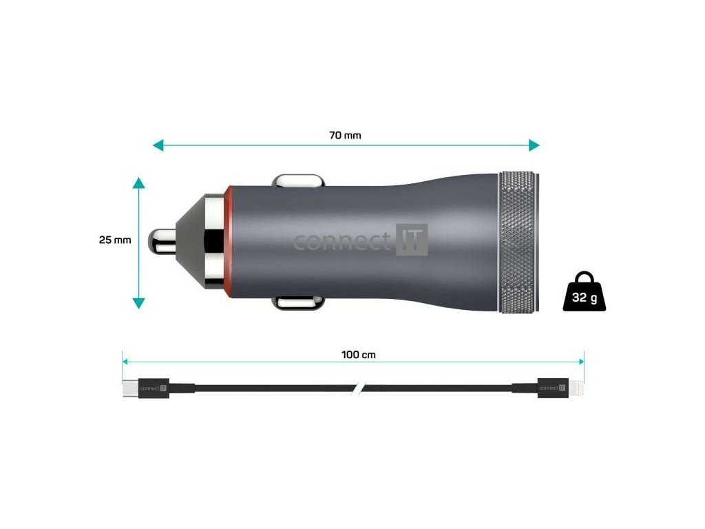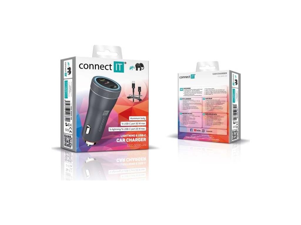 Díky této ojedinělé kombinaci portů, lze nabíjet zařízení jak s Lightning vstupem, tak USB-C vstupem jedním univerzálním kabelem, který je dodávaný v balení. Nabíječka je určená pro napájení i nabíjení mobilních telefonů, tabletů, power bank, akčních kamer, navigací, kamer do auta, elektronických čteček knih a mnoha dalších přenosných zařízení. Technologie Power Delivery (PD) umožňuje rychlonabíjení o výkonu 30 W. Nechybí ani modrá LED kontrolka signalizující správné zasunutí nabíječky v autozásuvce. Součástí balení je i velice kvalitní kabel Lightning -> USB-C, který dokáže přenést až 27 W.
