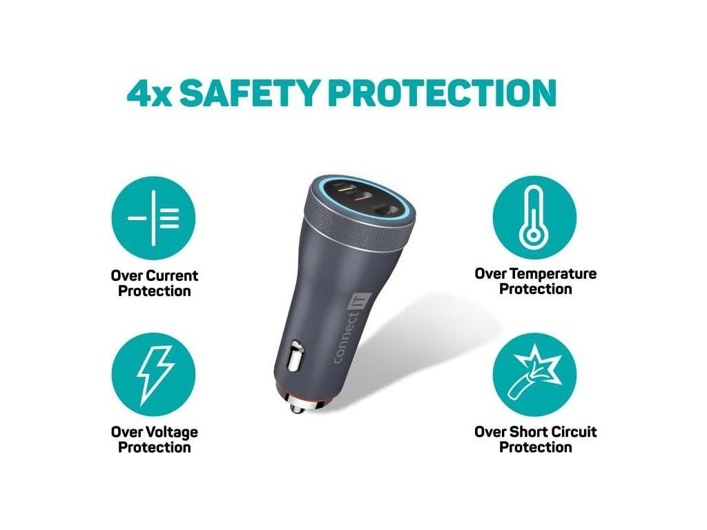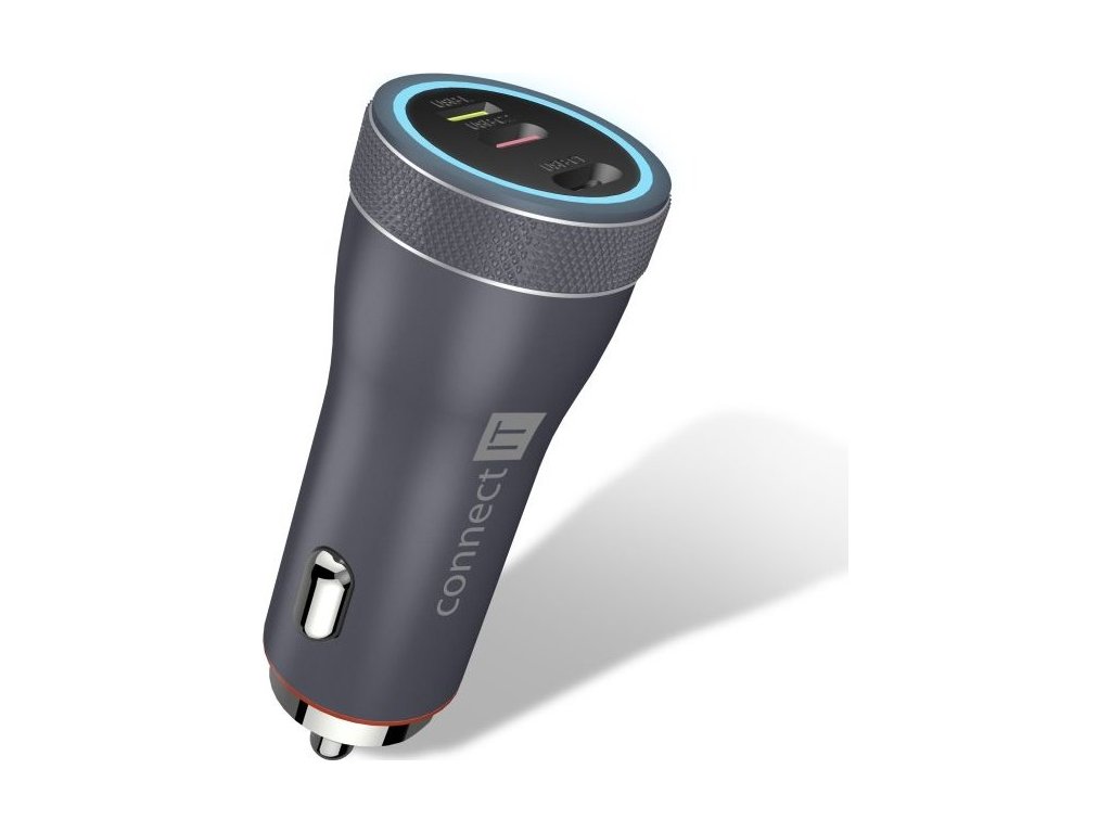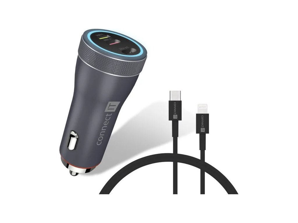 Unikátní tříportová nabíječka do auta CONNECT IT "Duplex" s kombinací výstupů USB-C (Type C) a Lightning s kombinovaným výkonem 55 W.