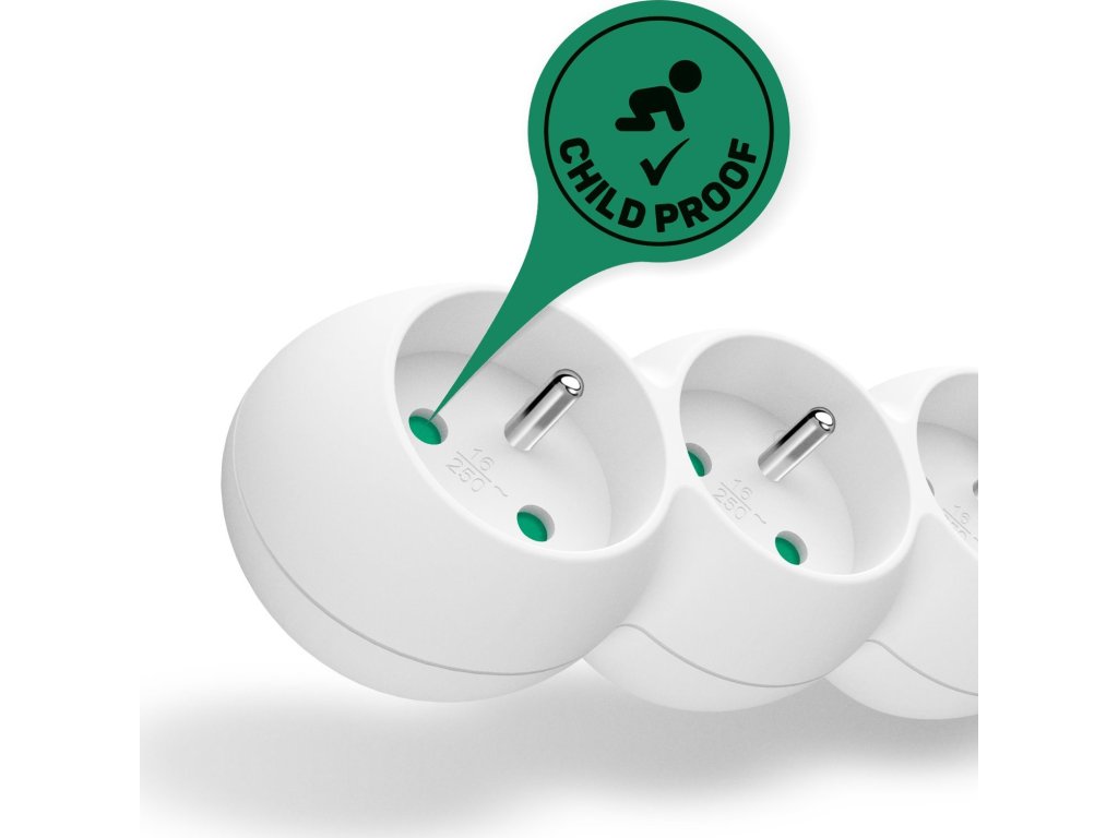 Dětská ochrana všech zásuvek (zásuvky jsou přístupné pouze v případě zasunutí obou vidlic najednou, nelze tedy zasunout jednotlivě např. pouze šroubovák nebo pletací jehlici)