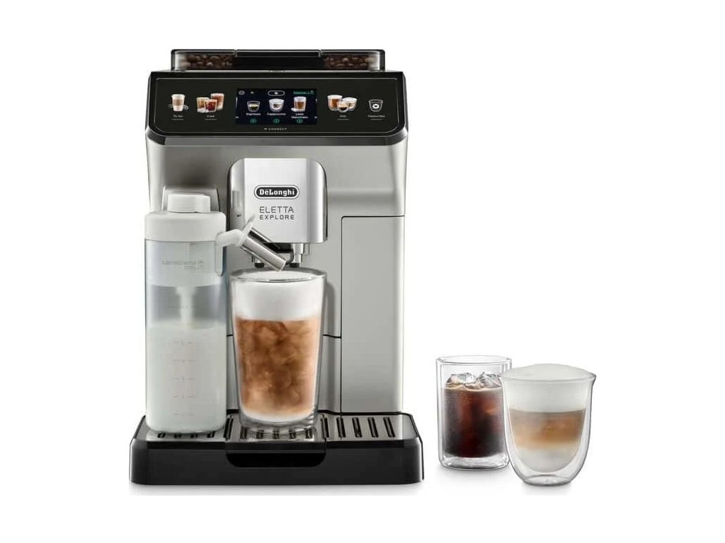 Potřebujete ráno probudit a pozitivně se naladit na celý den? Automatické espresso DeLonghi Eletta Explore ECAM 450.65.S vám připraví oblíbený šálek kávy rychle a snadno. Kávovar zvládá více než 50 horkých i studených nápojů, jistě si každý najde svého favorita. Kávovar má tlak 19 bar a výkon 1 450 W. Mléčné nápoje připraví jediným stiskem. Na přední straně se nachází dotykový 3,5" TFT displej s intuitivním ovládáním a 4 dotykovými ikonami. Přístroj je vybaven tryskou na horkou vodu, 2 karafami na studenou a horkou mléčnou pěnu a zásobníkem na vodu s objemem 1,8 l. Teplota vody má 3 stupně regulace. Funkce Káva s sebou a příprava 2 šálků najednou šetří váš čas.Doporučená maximální velikost šálku je 160 mm. Pomocí Wi-Fi připojení a mobilní aplikace Coffee Link získáte přístup k více než 100 receptům a dálkovému ovládání. Technologie Bean Adapt se absolutně přizpůsobí druhu kávy. S technologií Cold Extraction připravíte jedinečné cold brew, a to do 5 min. Kávovar má paměť pro 4 uživatelské profily. Nechybí ani možnost regulace intenzity a teploty kávy, množství vody nebo hrubosti mletí. Kávovar je vybaven integrovaným ocelovým mlýnkem a má 13stupňové mletí. Kávovar je vhodný pro zrnkovou i mletou kávu. Po ukončení přípravy se aktivujte automatický čisticí program pro karafy, který brání usazování zbytkům kávy. De'Longhi dlouhodobě a bezchybně vytváří kvalitní a spolehlivé kávovary, které vám každý den vykouzlí úsměv na tváři.