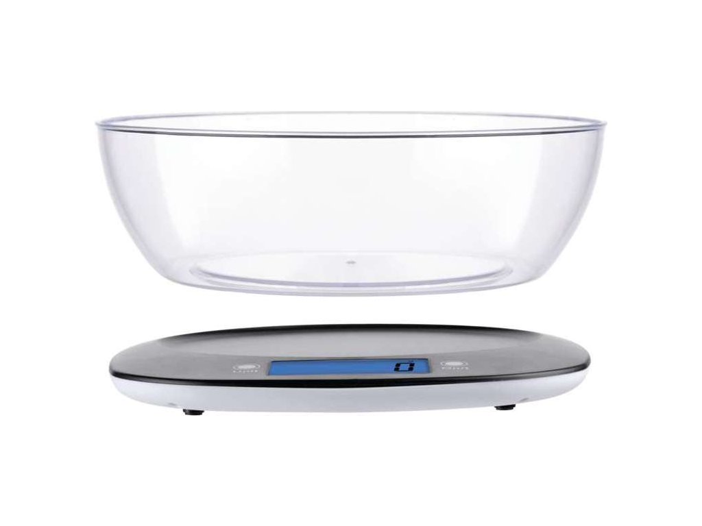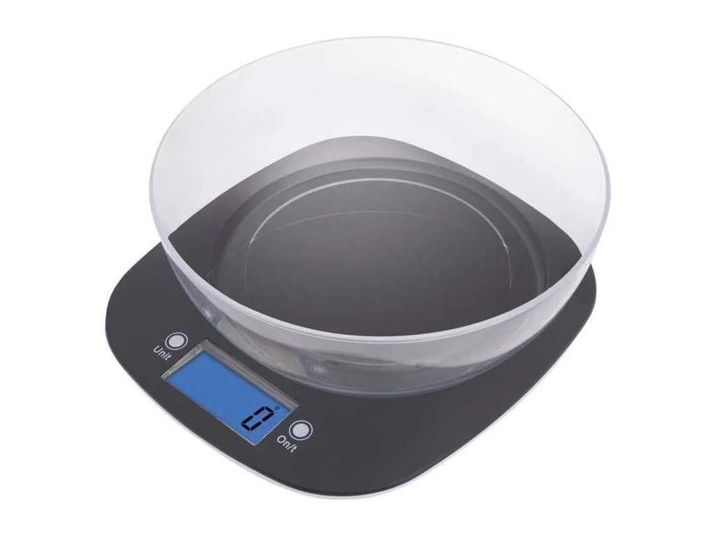 Vážící miska součástí váhy, maximální zátěž až 5 kg, podsvícený displej.
